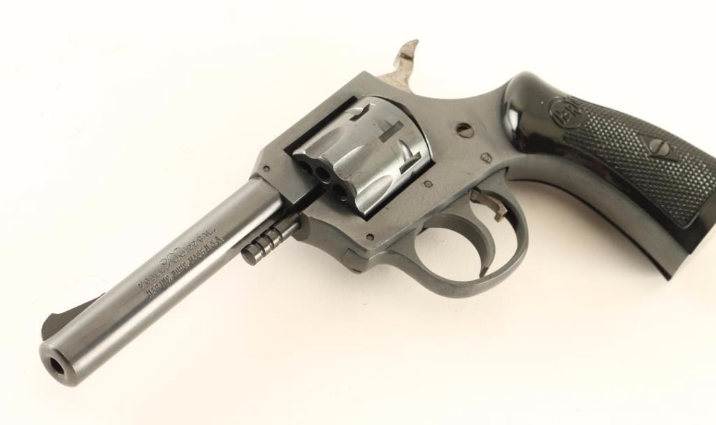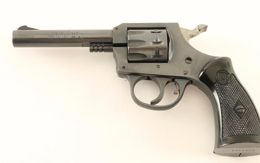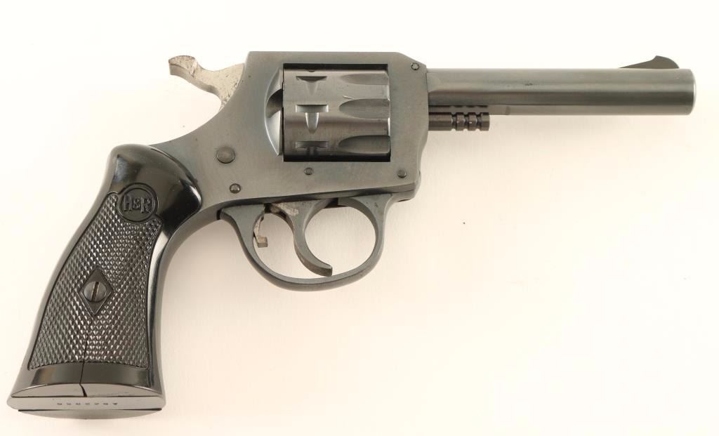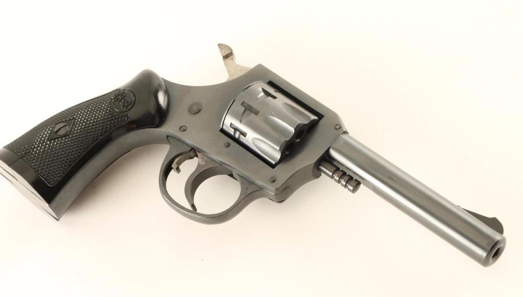 Medium frame double-action revolver chambered in .22 Short, Long or Long Rifle, circa 1962-1973. Features a blued finish, 4" barrel, ramp front sight, square notched rear sight, fluted snap-out nine shot cylinder, smooth trigger with beveled edges, serrated wide hammer spur, square butt steel frame and two-piece diamond checkered black plastic grips with H&R insignias. A part of the screw head on the left side of the frame has sheared off. The revolver exhibits approximately 90% of it's original blued finish showing minimal handling marks and some scattered light emerging surface rust. Action performs well with some play in the lock-up, bore is excellent and plastic grips are good with a large crack extending from the screw to the butt on the right panel. Condition is good to very good. ***Modern Firearm***