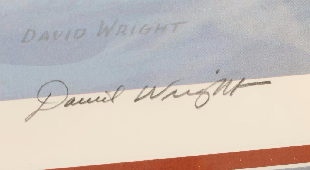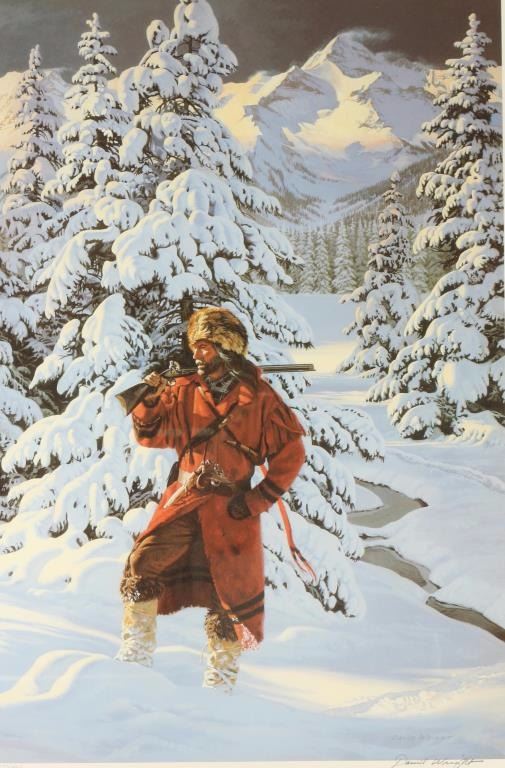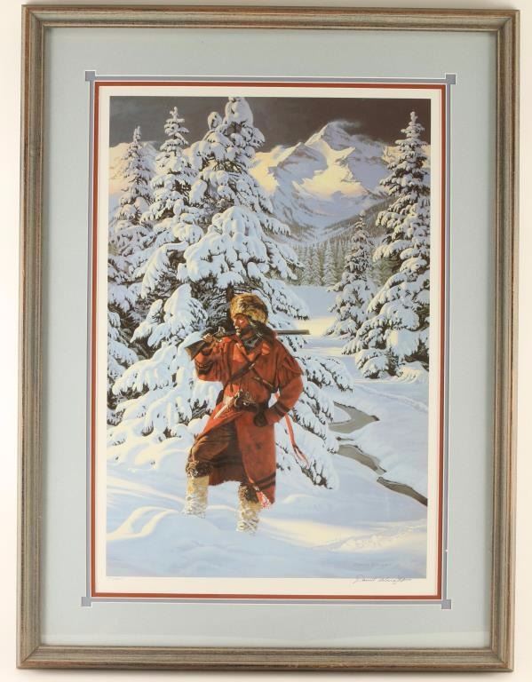 "Mountain Man in Snow" by David Wright, 577/1400 signature lower right. Image measures 16x23 3/4" in triple mat with shaped corners and a rustic wood frame. Born in Rosine, Kentucky in 1942 and raised in Tennessee, David Wright has always had a close association with the two major subjects of his work: the country landscape and American history. Professionally trained as an artist with study in Europe, Wright entered the competitive field of commercial art as an illustrator and designer in 1962. His career was interrupted in 1964 by two years of service in the U.S. Army. In 1973 he joined a newly-formed company to market his prints, and five years later he phased out his commercial ventures and began devoting his time completely to fine-art landscape painting. In 1976 the interest in Wright's historical subjects of the American frontier began to garner increasing attention. Today, most all of his paintings are of historical subject matter. Wright is listed in "Who's Who In American Art" and was commissioned to do six paintings for the book "Nashville: The Face of Two Centuries" during the Nashville Century III Celebration. He was also commissioned to create the poster for the Fine Arts Pavilion for the 1982 World's Fair held in Knoxville, Tennessee. His paintings have been used as covers for numbers of magazines and books and his research has enabled him to write many historical articles for various publications as well as contributing chapters in books written about the American Fur Trade.