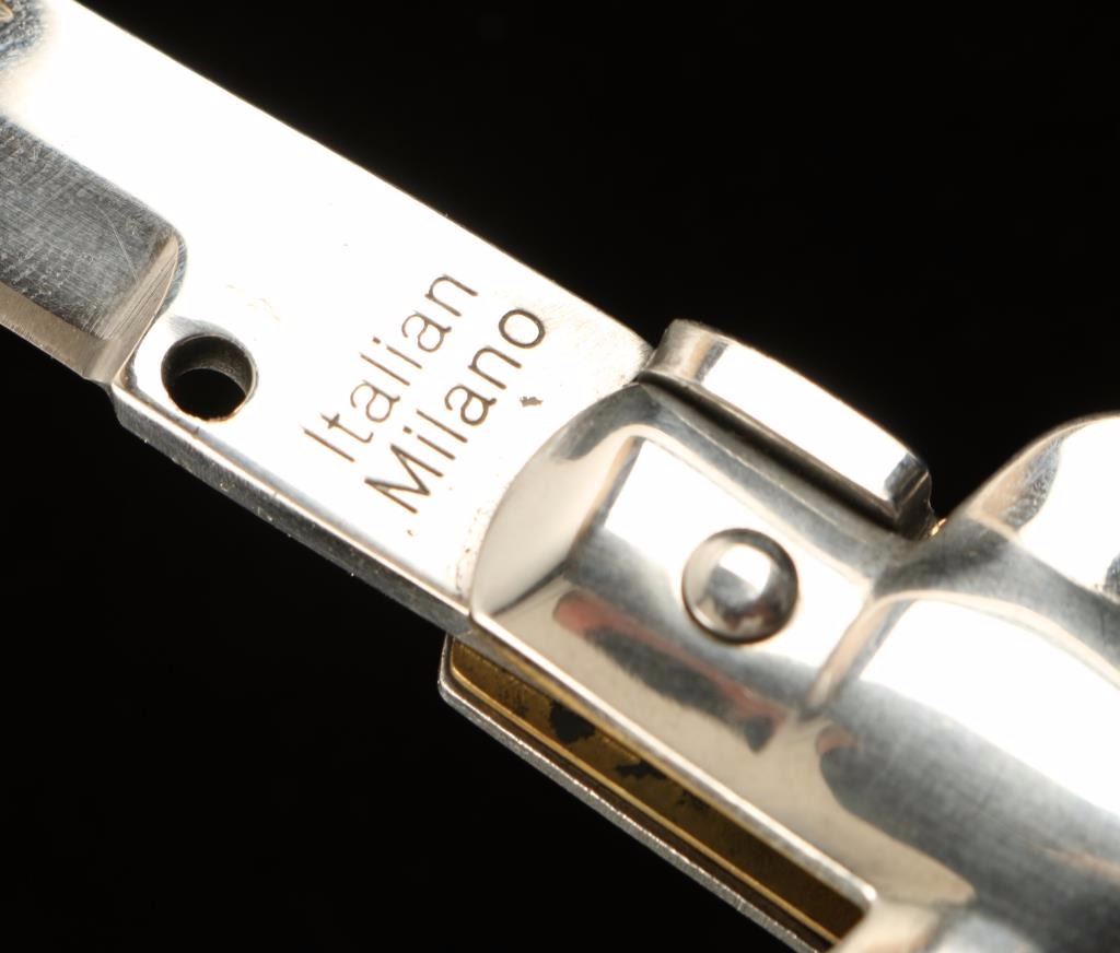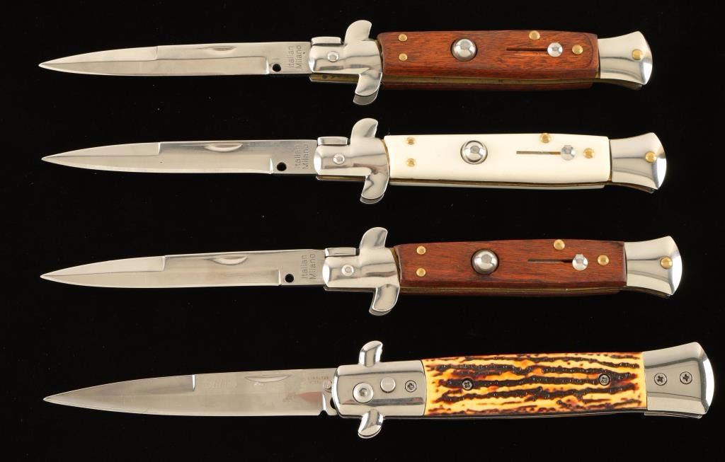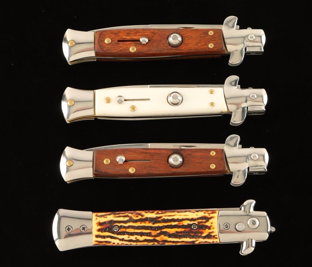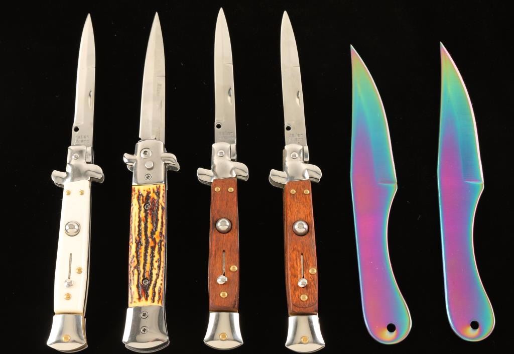 Four of which are push button auto knives-2 with wood handles, 1 faux ivory, and 2 rainbow iridescent throwing knives in case.