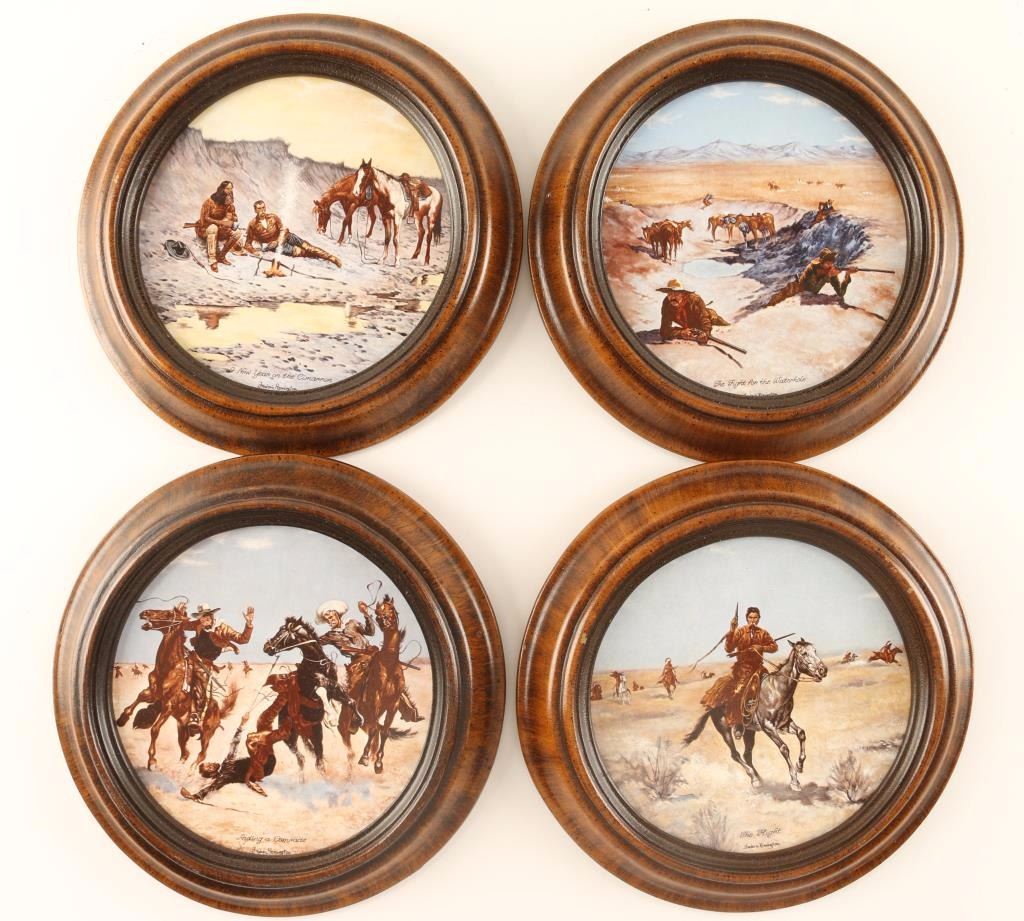 Entitled-'Fight for the Waterhole', 'Aiding a Comrade', 'A New Year on the Cimarron' and 'The Fight'. All are framed alike and are perfectly round.