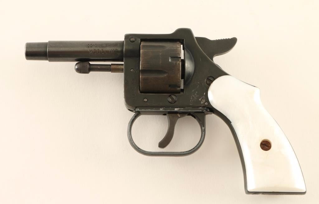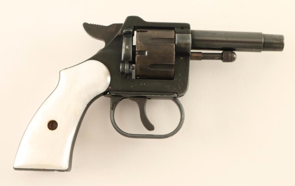 Crudely made small frame double-action revolver chambered in .22 Short. Features a blued/black finish, 2.5" barrel, missing front sight, square notched rear sight, fluted six-shot cylinder, smooth rigger, serrated hammer spur, manual ejector rod and two-piece faux mother-of-pearl grips. Revolver retains approximately 70% of it's original finish with high concentrations of wear on the cylinder, trigger guard and backstrap. Action performs well with solid lock-up, bore is very good and plastic grips are good. Condition is good. ***Modern Firearm***