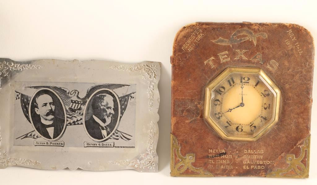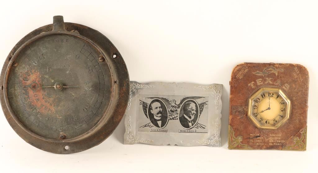 Including; a tin with Alton B. Parker and Henry G. Davis, leather backed brass clock with brass edge accents and 'Texas' across the top, 'Best Steam Engine Works, Lancaster, PA, No. 7, 22072 gauge measures 6 3/4" in dia. and shows rust.