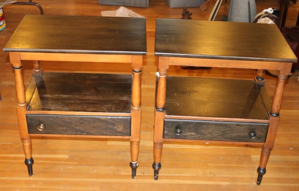 Two tables with single drawer and lower gallery shelf. Measures 28"h x 23"w x 16"d.