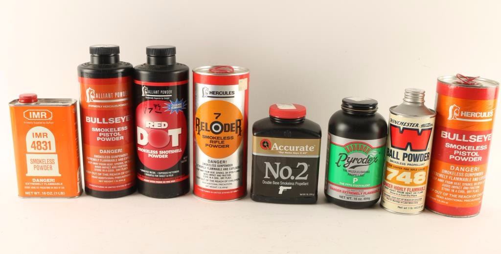 Including; IMR 4831 one pound, Bullseye smokeless powder one pound, Accurate #2 smokeless propellant one pound, Bullseye smokeless pistol powder, Pyrodex muzzle loading propellant one pound, Red Dot shotshell powder one pound, Reloader smokeless rifle powder one pound, Winchester ball powder one pound. All are sealed and unused.