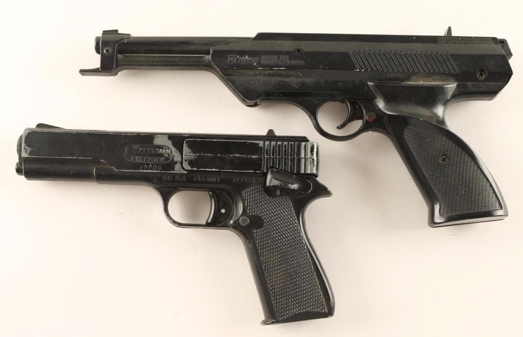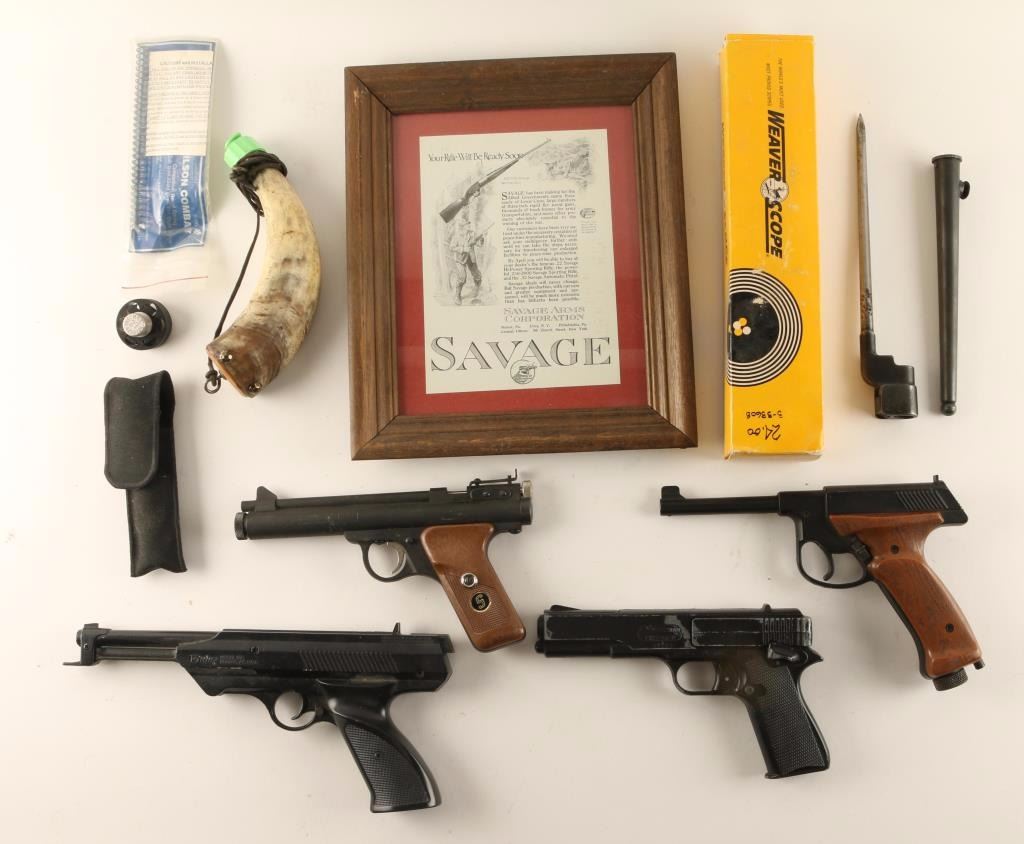 Including; powderhorn, flashlight, Weaver scope Mdl B22, Savage Rifle framed advertiser, Sheridan air pistol, Luger look alike BB gun, Marksman Repeater, Daisy Mdl 188 BB gun, 303 Brit bayonet and sheath, and a Wilson Combat 1911 recoil spring.