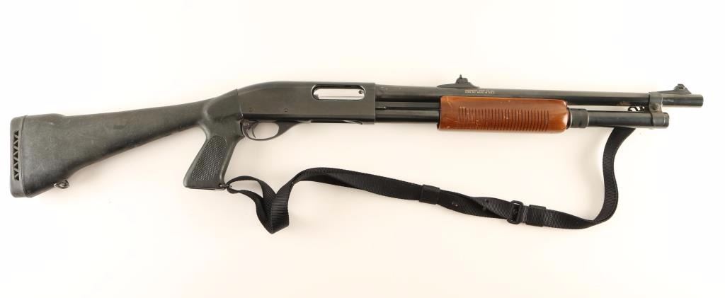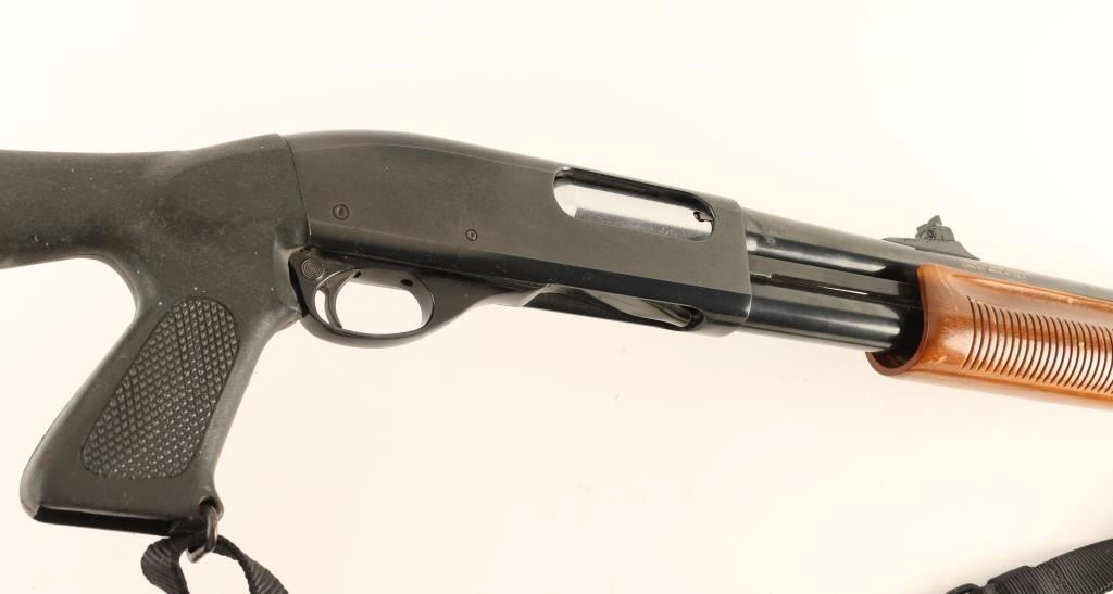'Wingmaster' Tube-fed slide action repeating shotgun chambered for 2 3/4" 12 gauge shells. Features a blued finish, 20" barrel, ramped blade front sight, adjustable sliding rear window sight, push button safety, beveled trigger, magazine tube extension, black nylon sling, grooved walnut slide handle and black synthetic shoulder stock with checkered pistol grip & rubber recoil pad. Shotgun exhibits approximately 87% of it's original blued finish showing light wear, a large spot of rust on the underside of the barrel, rust on the barrel band and light scattered rust on the receiver. Action is crisp, bore appears bright with some debris and stocks are good to very good. Condition is good++. ***Modern Firearm***