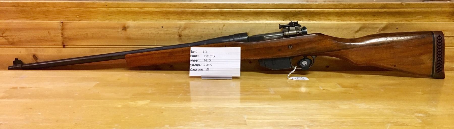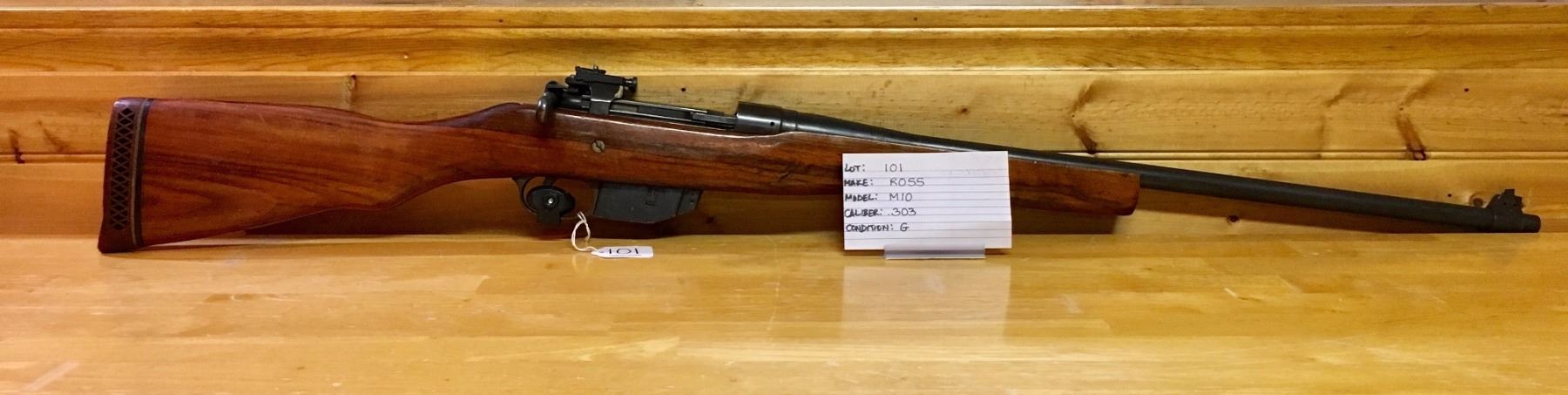 LOT:  101 MAKE:  ROSS MODEL:  M10 CALIBER:  .303 CONDITION:  G, SPORTERIZED S/N:  NONE