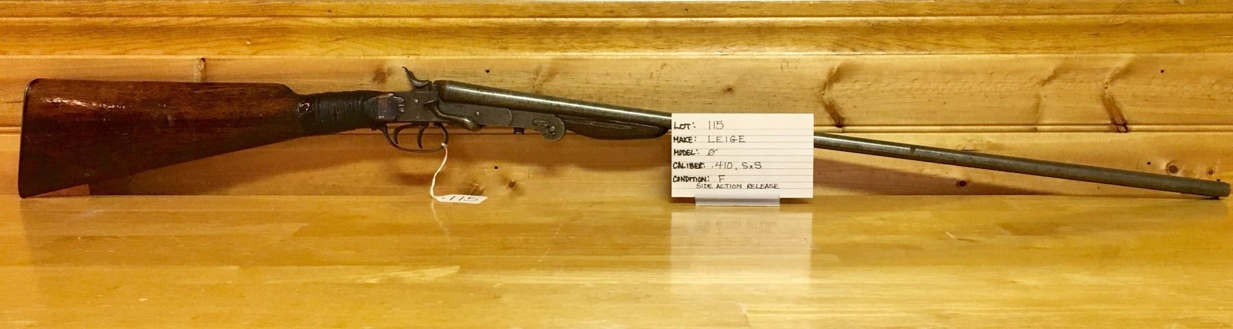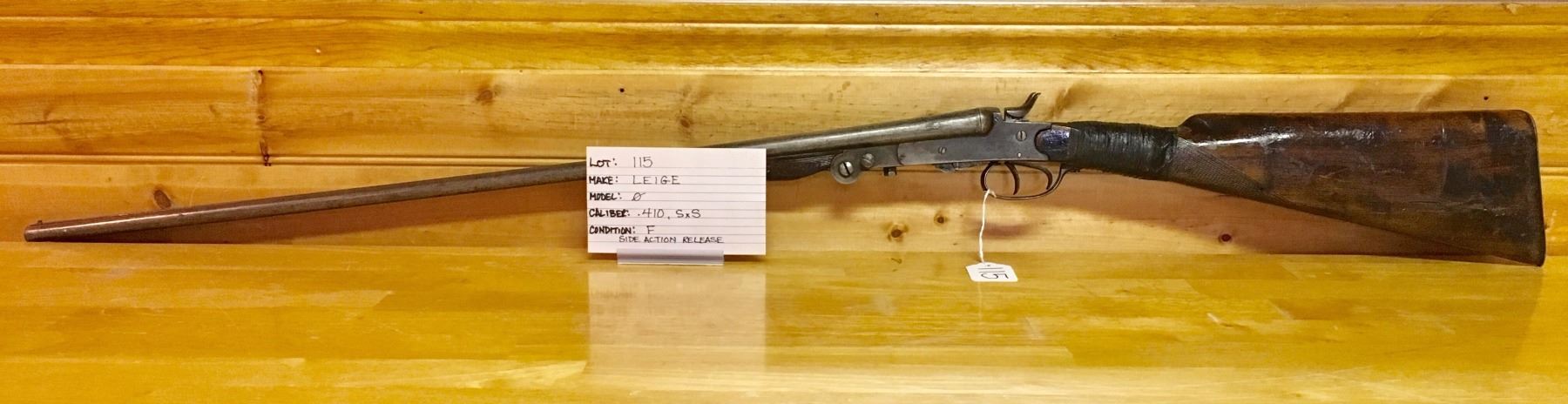 LOT:  115 MAKE:  LEIGE MODEL:  NONE CALIBER:  410, SxS, SIDE ACTION RELEASE CONDITION:  F S/N:  NONE