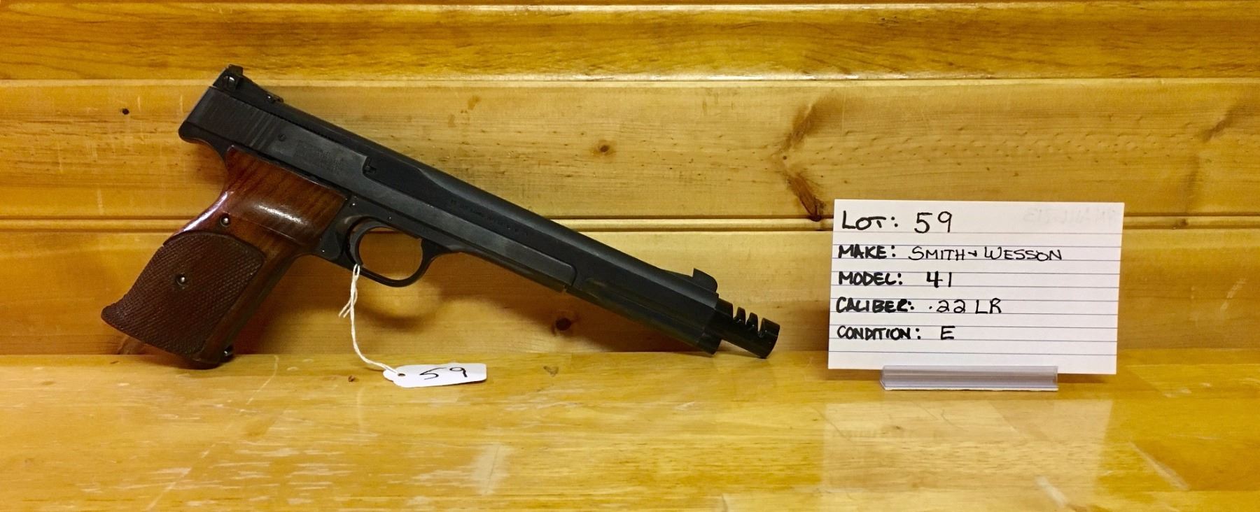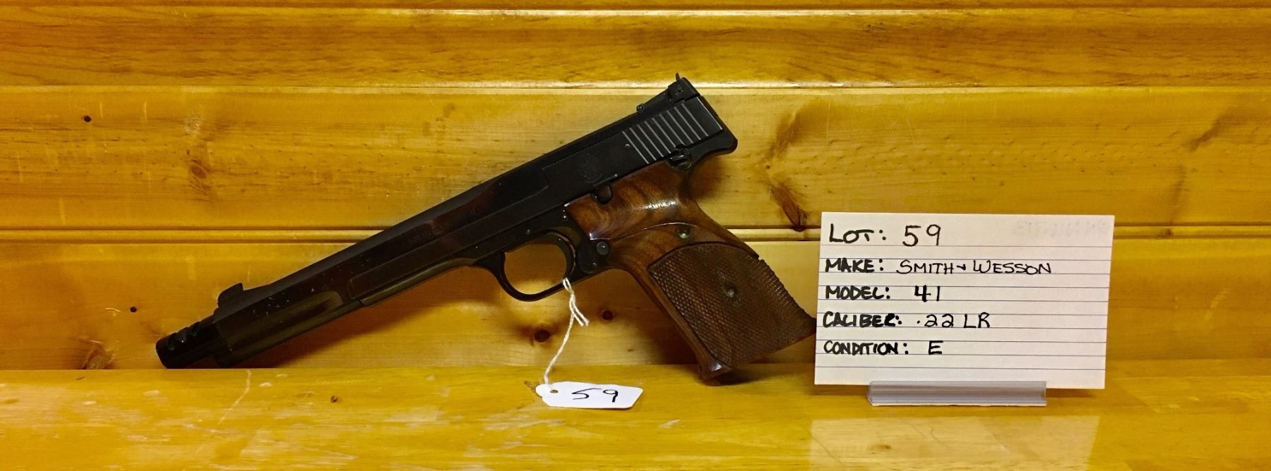 LOT:  59 MAKE:  SMITH + WESSON MODEL:  41 CALIBER:  .22 LR CONDITION:  E S/N:  A116713 ?NOTE:  RESTRICTED