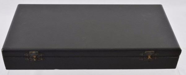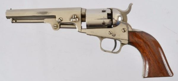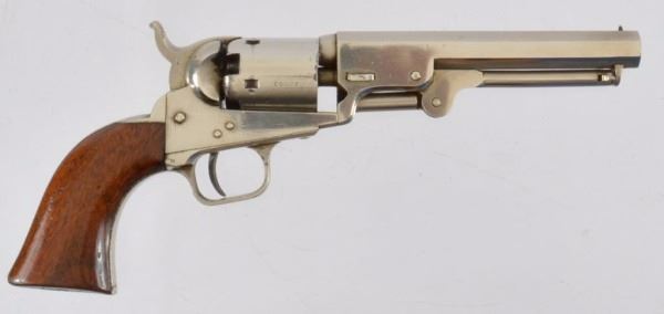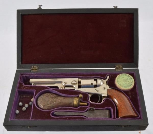 95% + Original nickel. French cased with accessories. 5" octagon barrel. Walnut grips. Gun was made in 1854 and marked "Address Saml Colt/New York City" on the top of the barrel and Colt's patent on the left