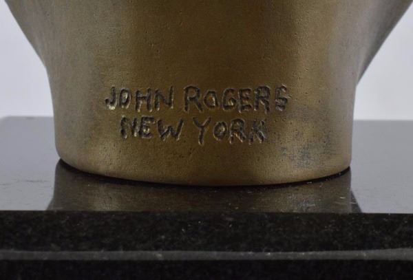 Bronze but by John Rogers (American, 1829-1904). John Rogers mostly known for his mass production of plaster images of early American life as well as depictions of the Civil War. Rogers did only 3 bronze castings