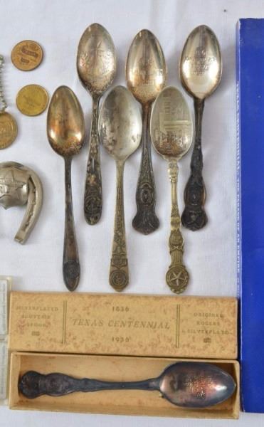 31 Pieces. 7 Spoons,7 coin, 10 post cards, 1 cook book badgs ,1 ring ,a ti clip,1 box matches, 1 beltbuckle,1 reflector, towell rack, 1 horse shoe and a letter opener. 1 umbrella, 1 pen, 1 book.