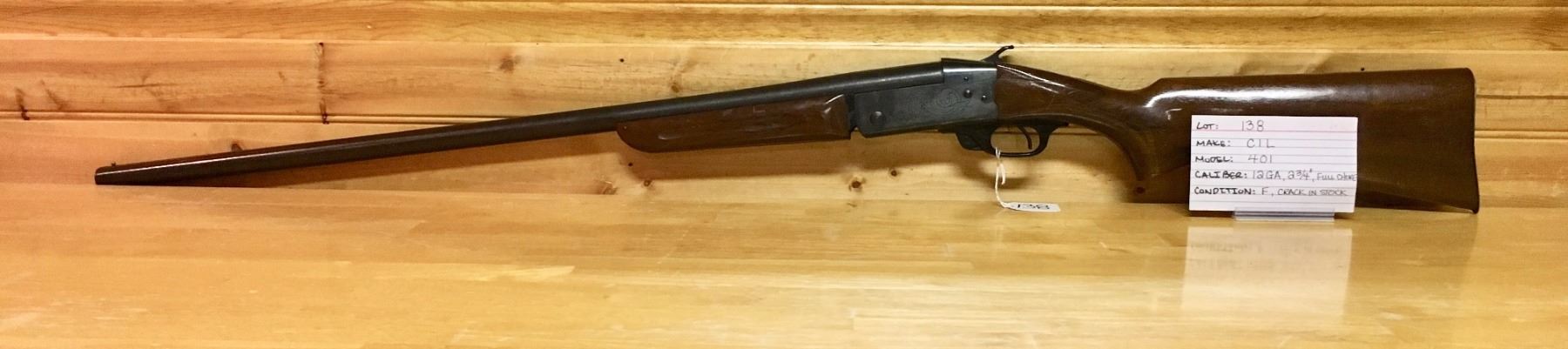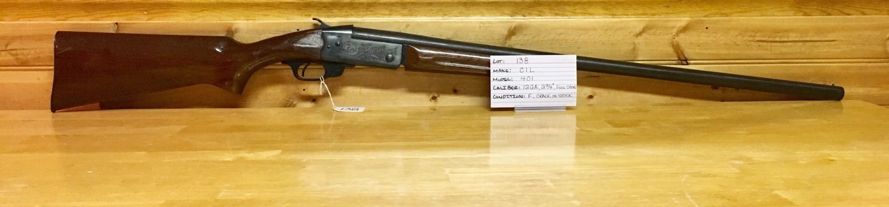 LOT: 138 MAKE: CIL MODEL: 401 CALIBER: 12 GA, 2 3/4", FULL CHOKE CONDITION: F, CRACK IN STOCK S/N: 18101