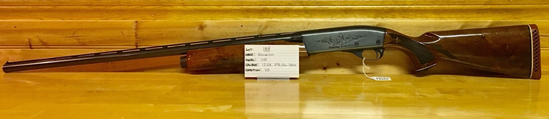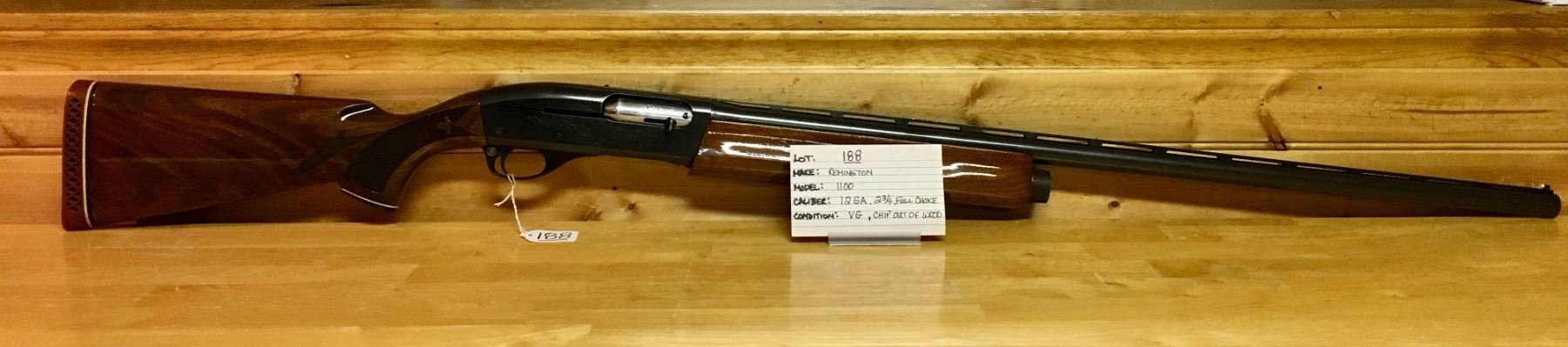 LOT: 188 MAKE: REMINGTON MODEL: 1100 CALIBER: 12 GA, 2 3/4", FULL CHOKE CONDITION: VG, CHIP OUT OF WOOD S/N: 18312V