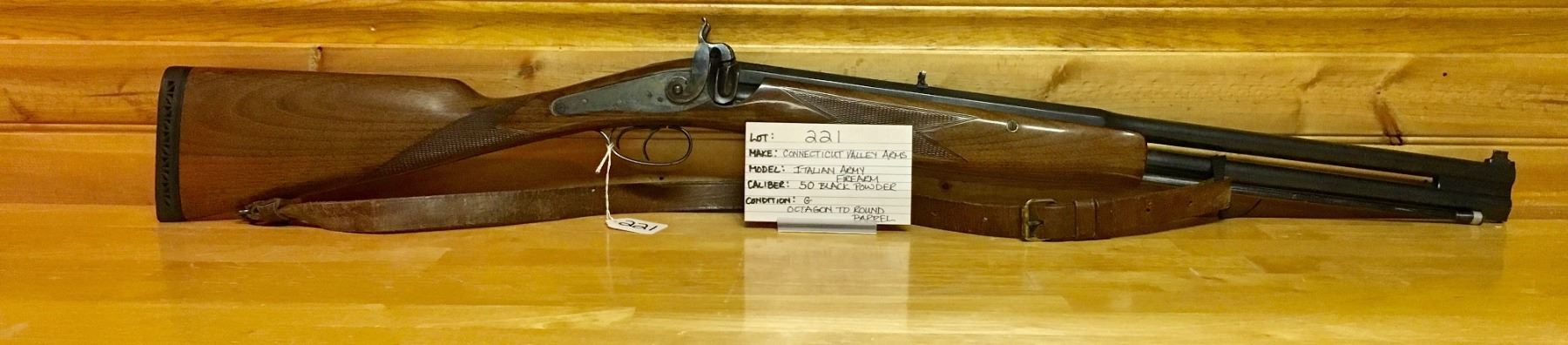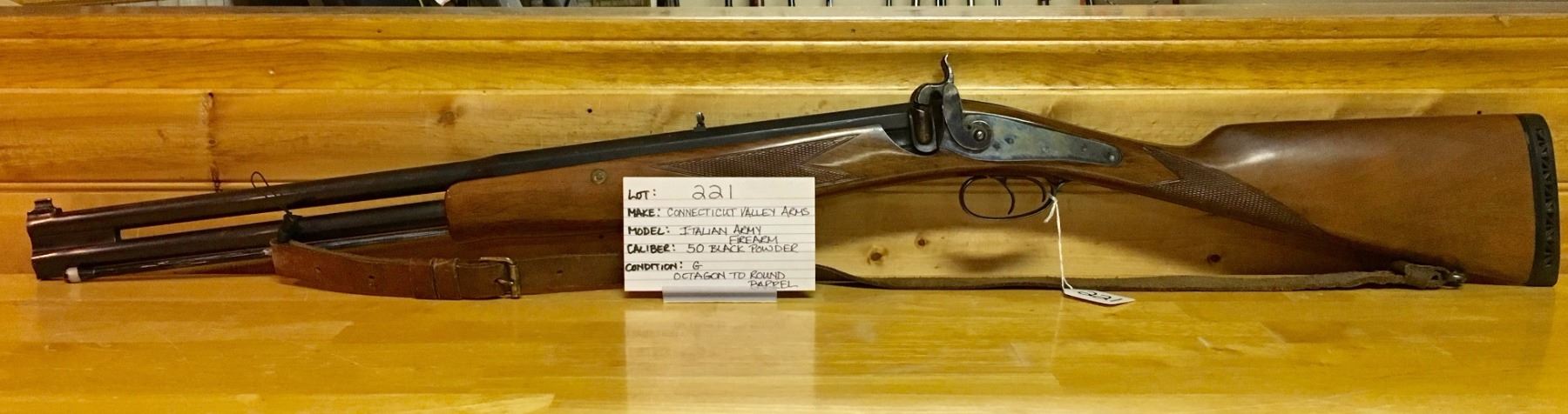 LOT: 221 MAKE: CONNECTICUT VALLEY ARMS MODEL: ITALIAN ARMY FIREARM CALIBER: .50 BLACK POWDER CONDITION: G, OCTAGON TO ROUND BARREL S/N: 2820