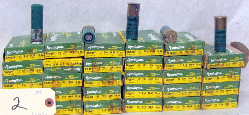 145 RNDS. 2 3/4" RIFLED REMINGTON SLUGGERS 7/8 OZ. WATER DAMAGE AND SOME SHELLS HAVE CORROSION