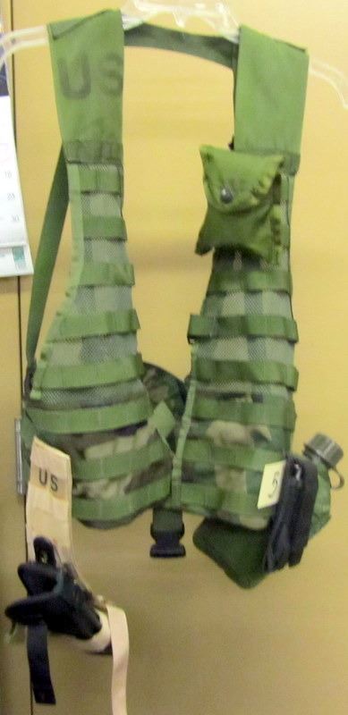 GREEN VEST STYLE BATTLE HARNESS, BELT HAS A HOLSTER, CANTEEN, FIELD DRESSING POUCH, MAGAZINE HOLDER WITH 2 1911 MAGS