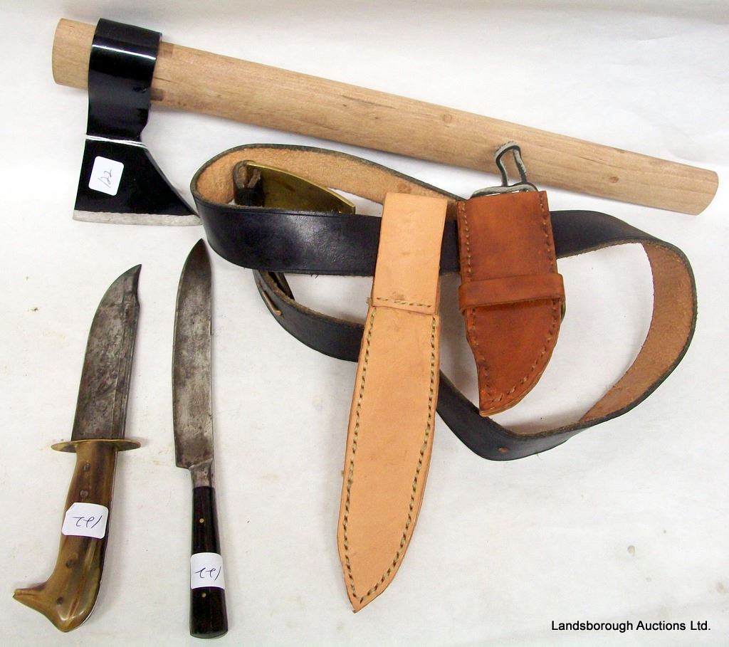 TWO SHEATHED KNIVES ONA CSA BELT WITH A HATCHET.