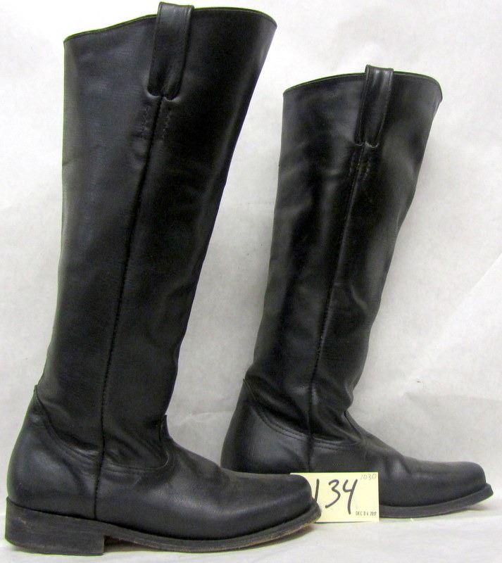 REPRODUCTION UNION CIVIL WAR WOOL JACKET WITH 2 GOLD BARS ON SKY BLUE BACKGROUND ON EACH SIDE OF COLLAR SIZE 52, WHITE 4 BUTTON SHIRT, PAIR OF HIGH SQUARE TOED LEATHER BOOTS GUESSED TO BE MENS SIZE 8