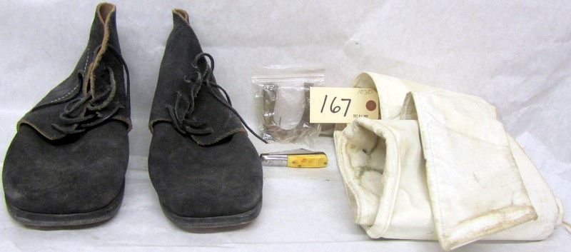 VARIOUS POUCHES, BACK PACK, CANVAS BAGS, PAIR OF REENACTMENT CIVIL WAR ERA SHOES AND GUN CASE AND OTHER PIECES OF CANVAS ARTICLES, SOME REPRODUCTION CIVIL WAR BUTTONS INFANTRY AND CSA, CANVAS DUFFLE BAG