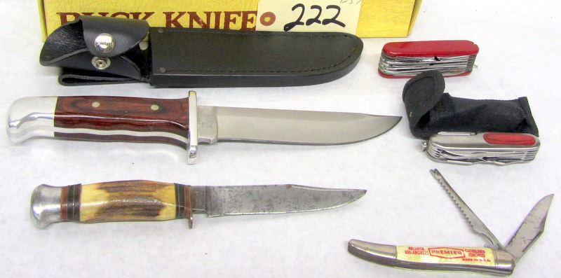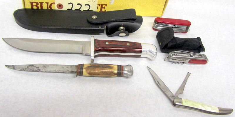 BUCK KNIFE MODEL 124 IN NICE SHAPE, 1 SOLINGEN GERMANY HUNTING KNIFE BLADE HAS SOME PITTING & NO SHEATH, IMITATION SWISS ARMY KNIFE, 1 FISHING KNIFE, 1 MULTI KNIFE