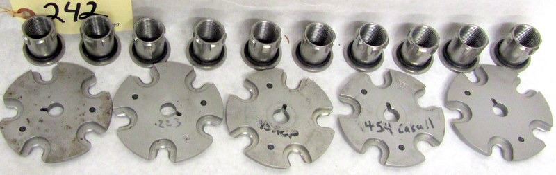 HORNADY LOCK & LOAD AP PRESS WITH TEN BUSHINGS AND 5 SHELL PLATES ONE IS .454 CASULL, ONE IS .223, ONE IS .45 ACP AND TWO UNKNOWN, THERE ARE NO PRIMER TUBES WITH THIS PRESS