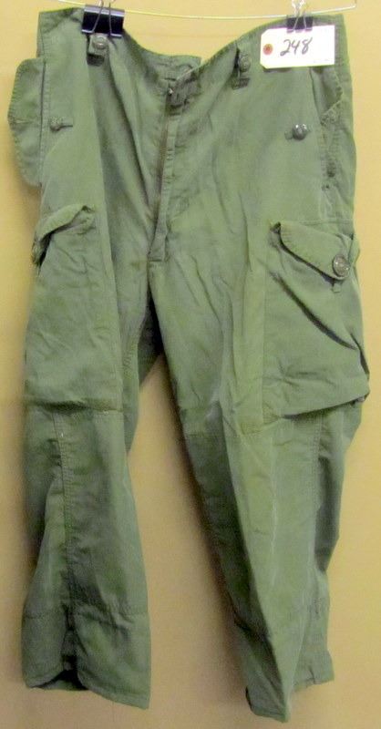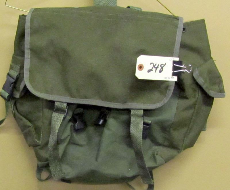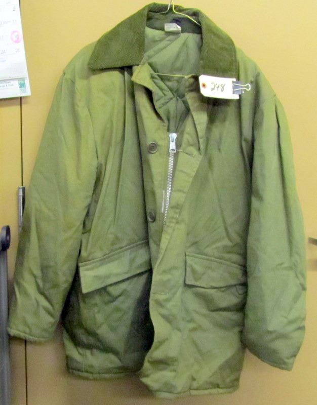 USED GREEN INSULATED HYDR STYLE PARKA WITH HOOD SIZE 40 HAS SOME STAINING, GREEN MILITARY STYLE CARGO PANTS SIZE LARGE, GREEN BACKPACK MAIN POUCH AND TWO POCKETS WITH PADDED SHOULDER STRAPS