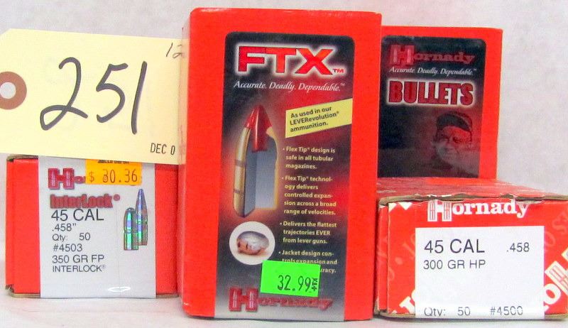 100 HORNADY FTX PROJECTILES 45 CAL. .458" 325 GR. FTX, 50 HORNADY PROJECTILES 45 CAL. .458" 350 GR. FP, 64 HORNADY PROJECTILES 45 CAL. .458" 300 GR. HP