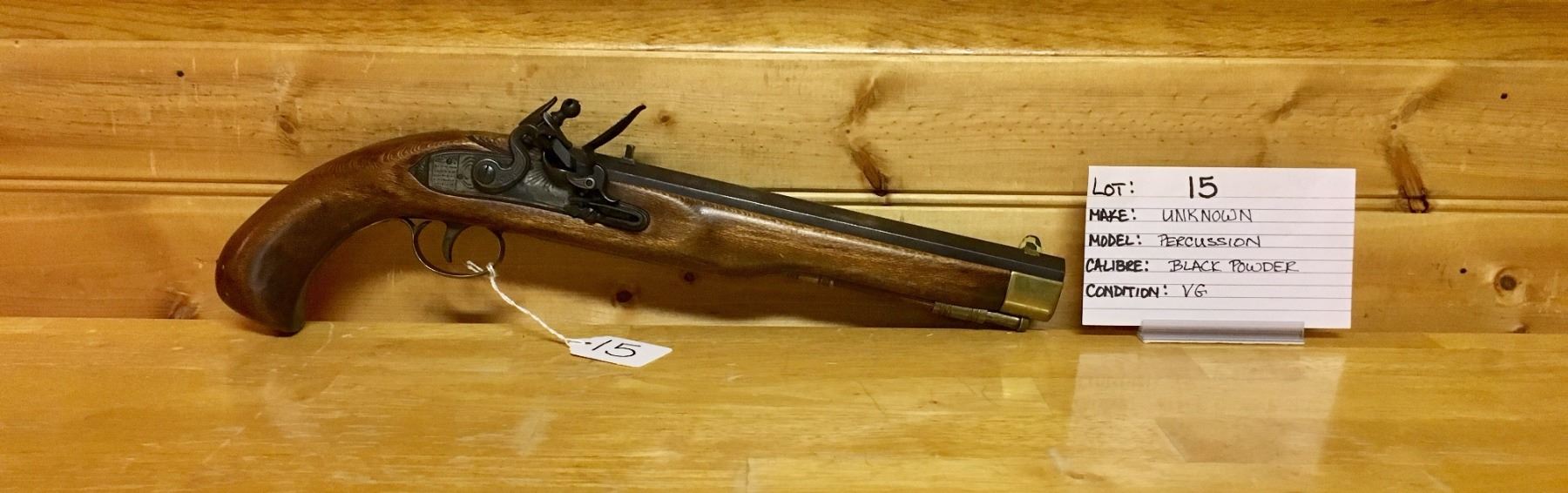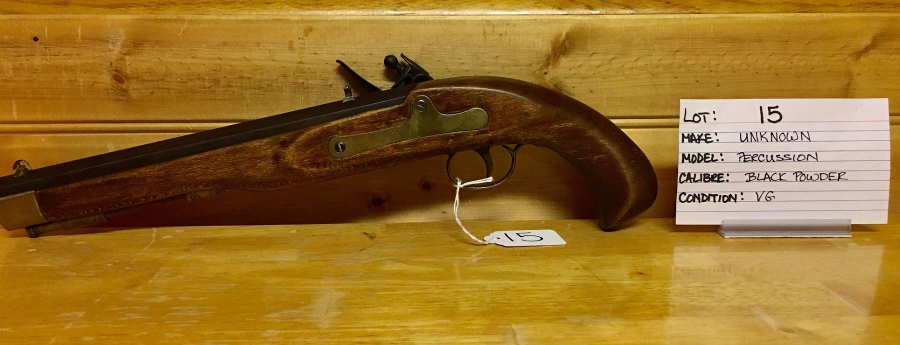 LOT:  15 MAKE:  UNKNOWN MODEL:  PERCUSSION CALIBER:  BLACK POWDER CONDITION:  VG S/N:  NONE NOTE: