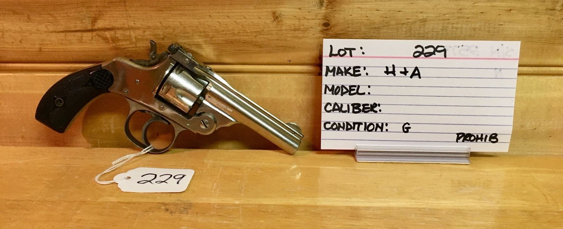LOT:  229 MAKE:  H&A MODEL:  NONE CALIBER: NONE CONDITION:  G S/N:  2573 NOTE:  PROHIB