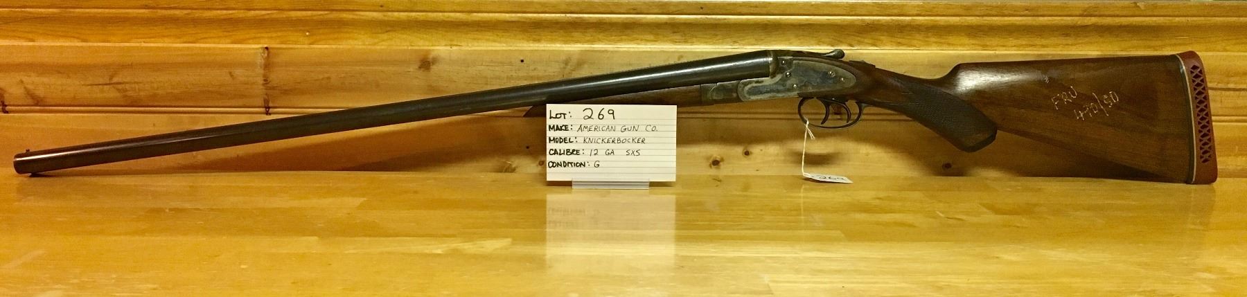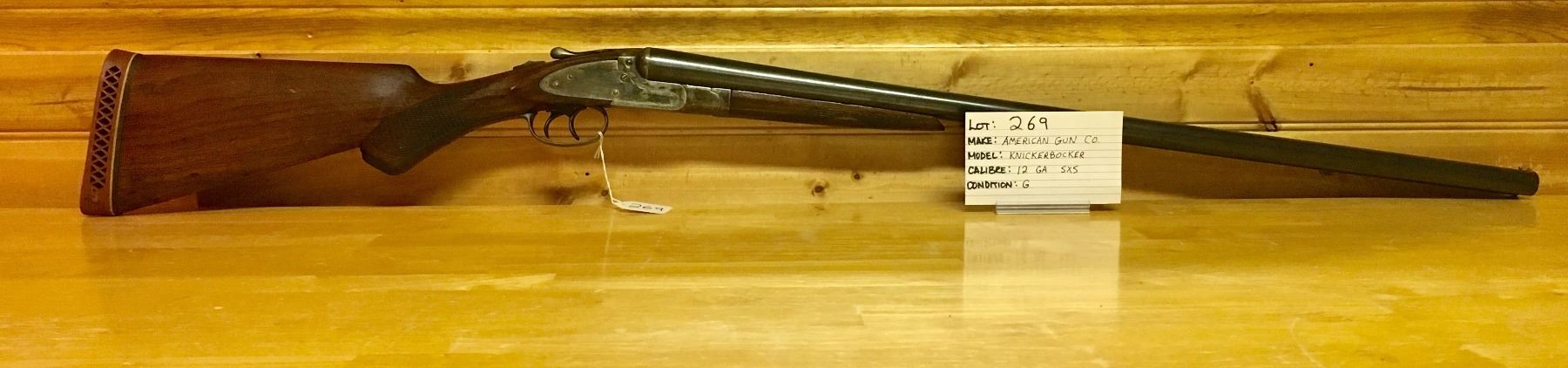 LOT: 269 MAKE: AMERICAN GUN CO. MODEL: KNICKERBOCKER CALIBER: 12 GA, SXS CONDITION: G S/N: NONE