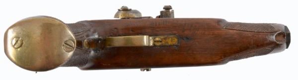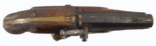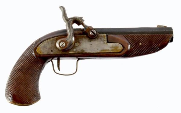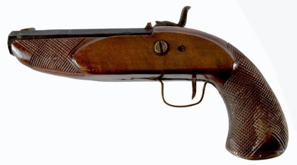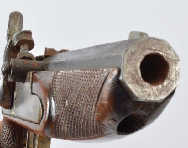 With checkered rifle wood stock. Unsigned. 5" barrel. A true early frontier handmade weapon.