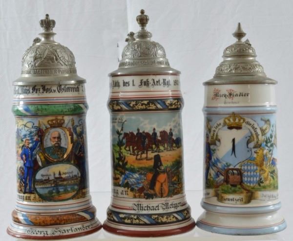 Lot 355 3 Antique Lidded Regimental Beer Steins