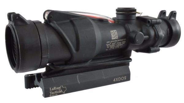 On a LaRue Tactical quick draw mount Model TA31RCO-M150CP. Tritium illuminated chevron reticle. Top of the line military issue. shows minimal use, in original pouch with manuals.