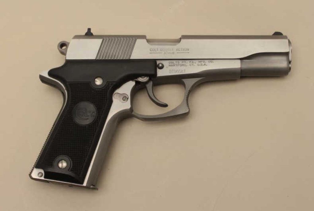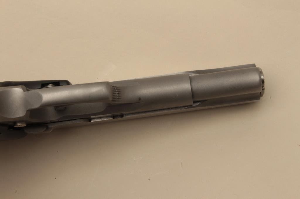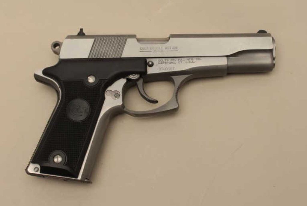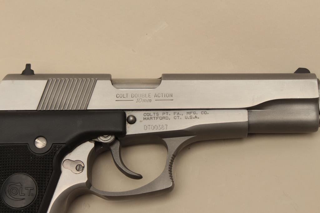 #DT00387. The pistol is in very good overall condition with a 5” barrel. The pistol retains nearly all of its stainless steel finish with small scratches and handling marks evident. The checkered plastic Colt grips are in very good condition showing little use. The bore is very good, the action crisp and markings are sharp on this desirable Colt double action pistol. The lot includes one Colt marked magazine. Est.: $500-$1,000. (Modern).
