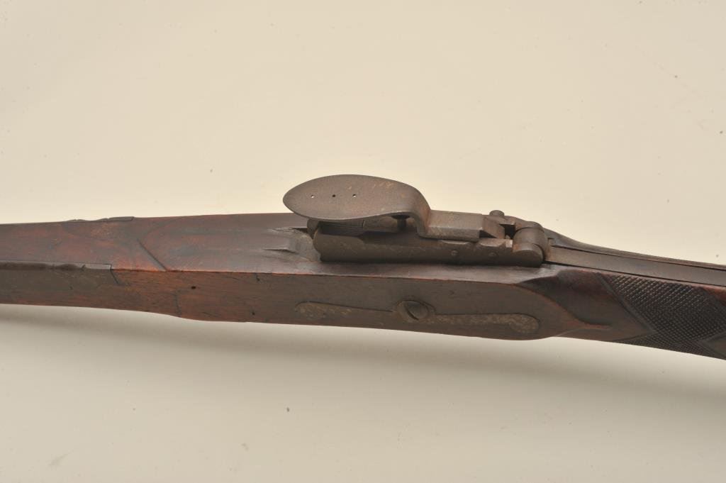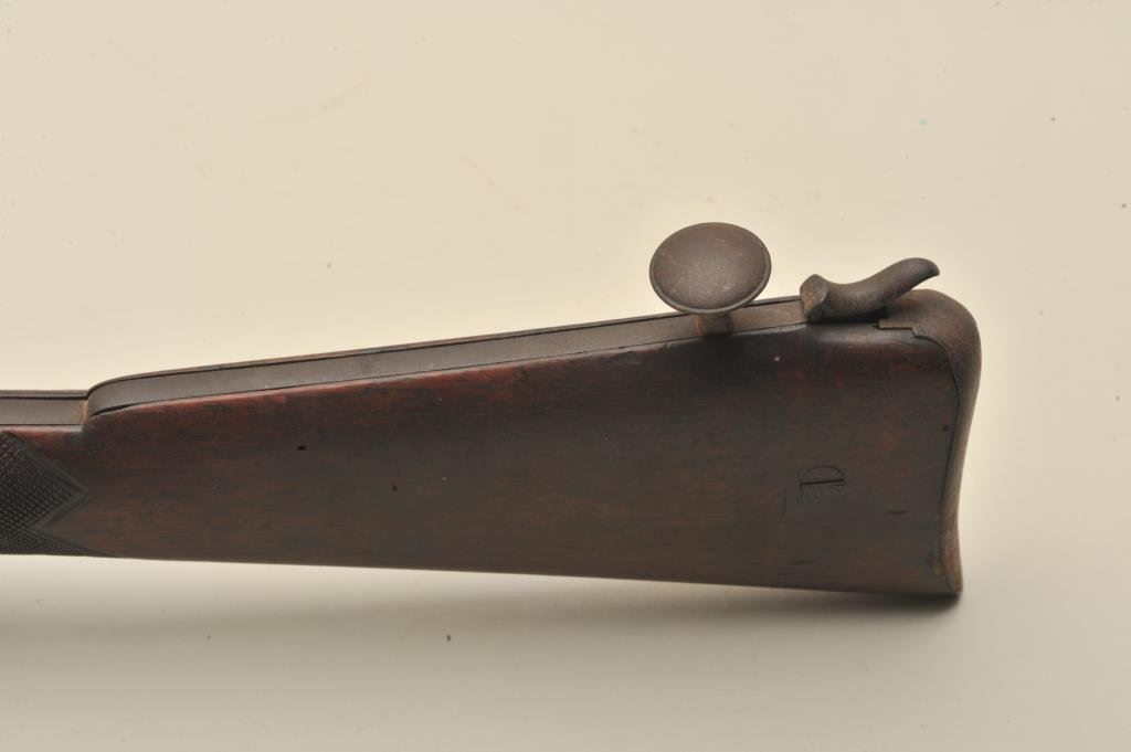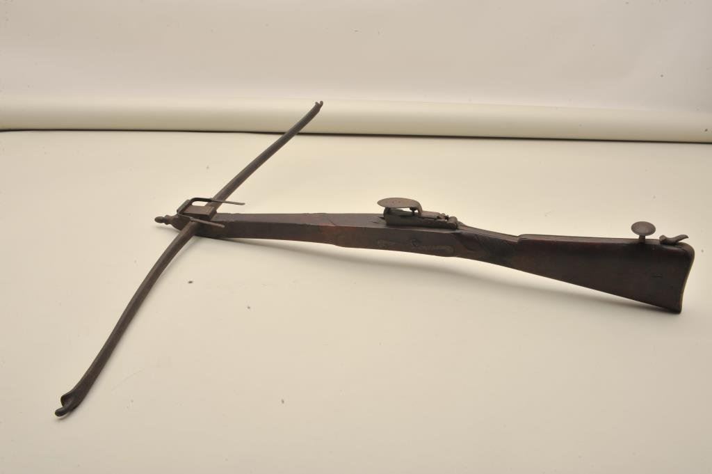 from tip to end and 31 ½” across forged steel bow. The cocking lever in integral to the stock. The condition is good to very good overall with some minor rust and pitting on the metal. The wood stock is also good plus showing normal age and imperfections. The bow string is missing. These were used in hunting small game in British Isles until replaced by air guns and small caliber rimfire arms later in the 19th century. Great decorator. Est.: $600-$1200