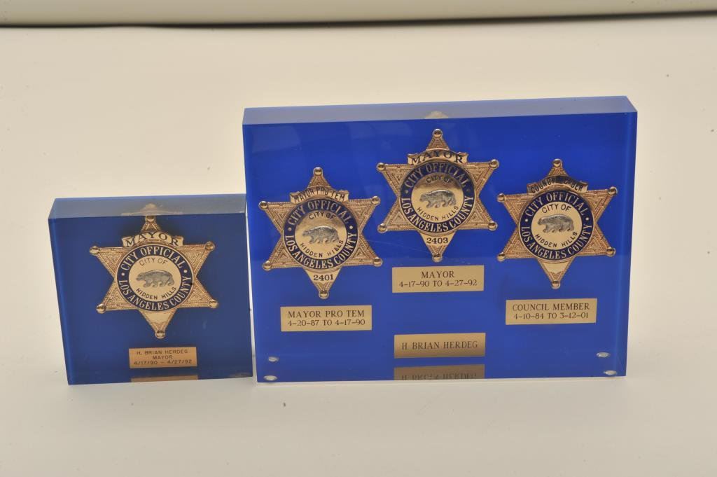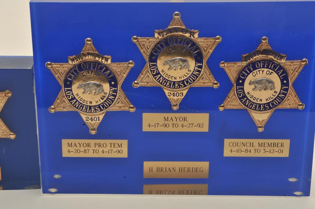 A. “H. Brian Herdeg-Mayor 4/17/90-4/27/92” and the badge reads “Mayor-Hidden Hills-Los Angeles County”. B,C,D. 3 badges displayed together Mayor, Mayor Pro Temp, Council member, Hidden Hills, L.A. County, 1990-01 with plaque inscribed “H. Brian Herdeg”. Sealed in leucite. Est.: $300-$600