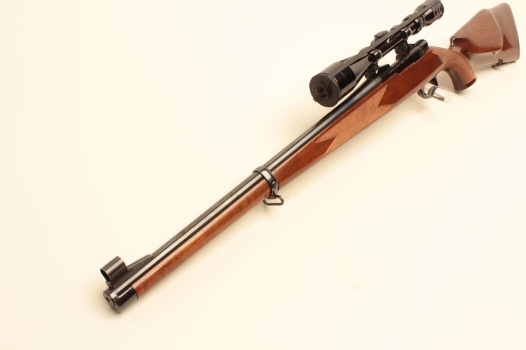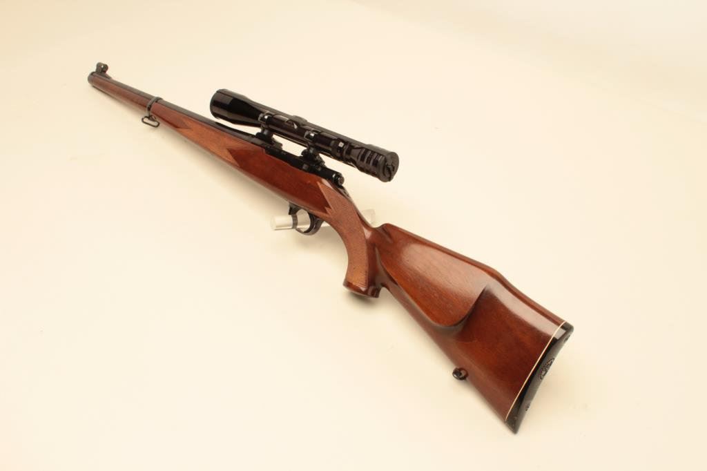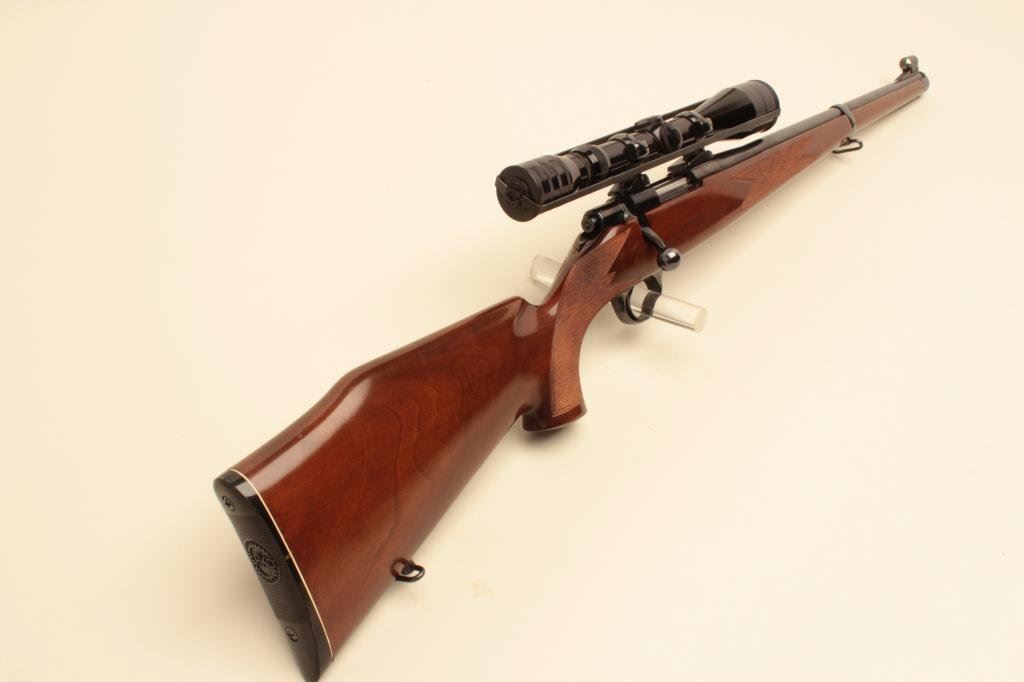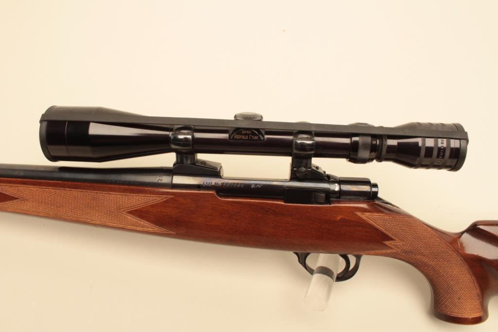 #103594. The rifle is in very good to nearly fine overall condition with a 20” barrel with a ramped, hooded front sight. The barrel and receiver retain nearly all of their blued finish with light wear from carry and use. The finely checkered Mannlicher style wood stock is in very good condition with small mars consistent with field use. The stock features sling swivels and ends with a Sako marked plastic butt plate. The rifle is topped with a Redfield 3 x 9 variable power scope with clear, crisp optics. The bore is good, the markings sharp and action is crisp on this desirable Sako sporter. Est.: $700-$1,400. (Modern).
