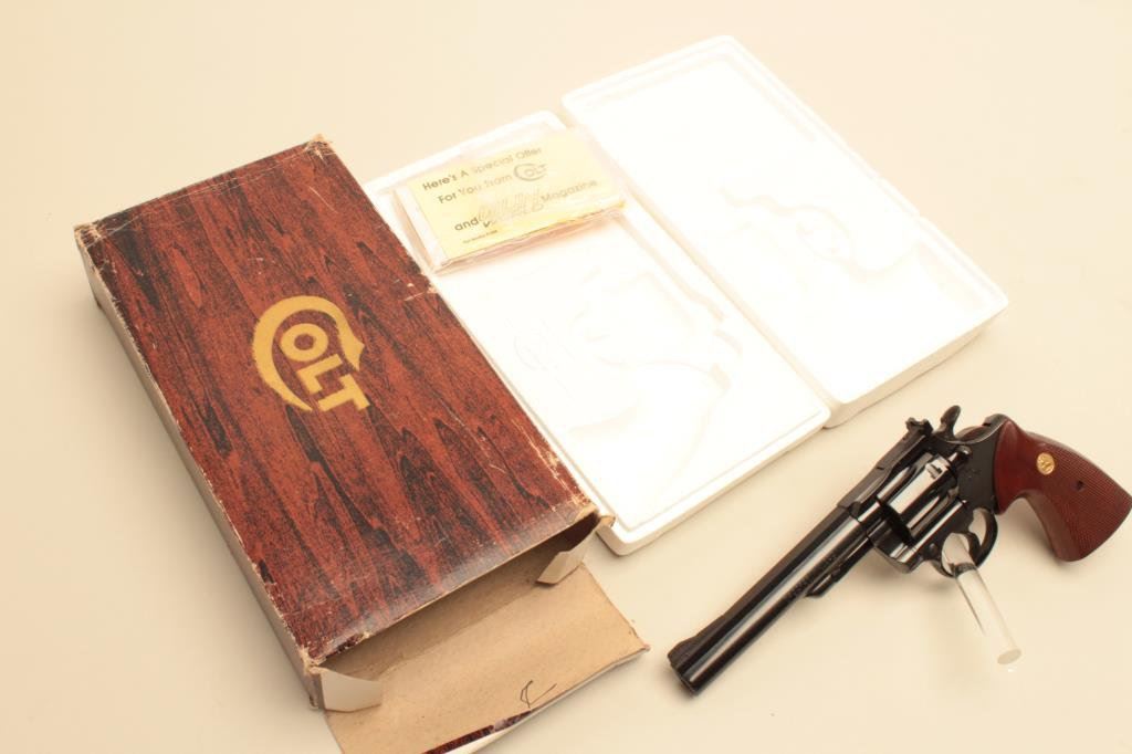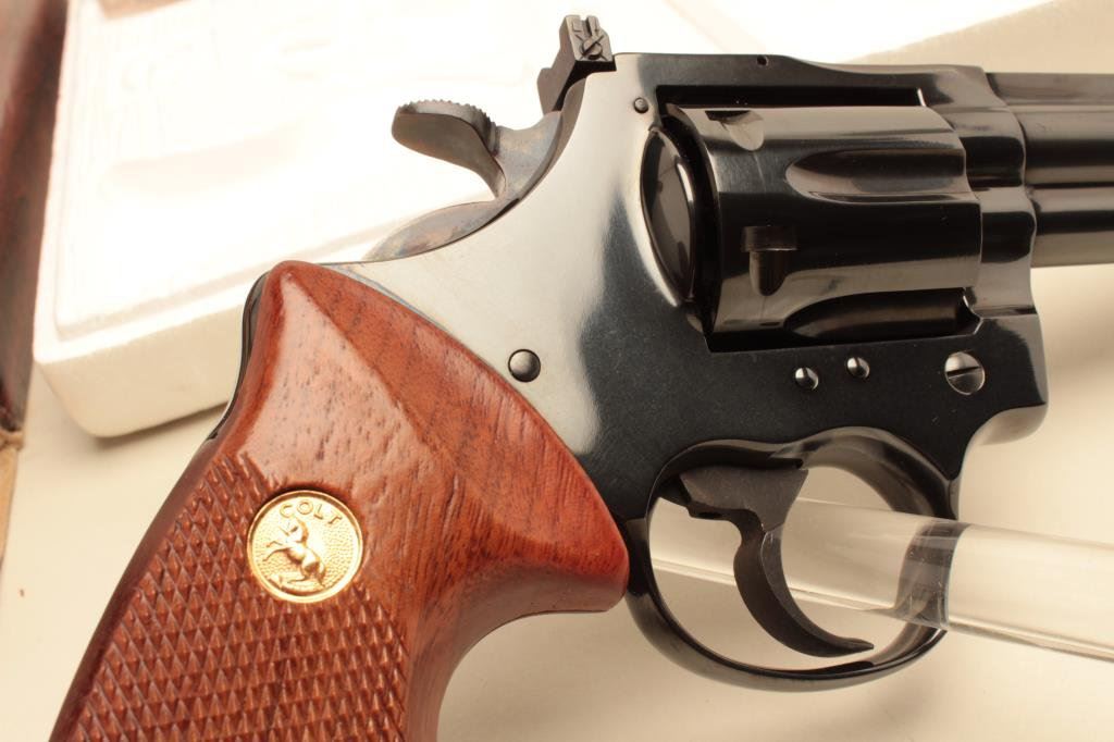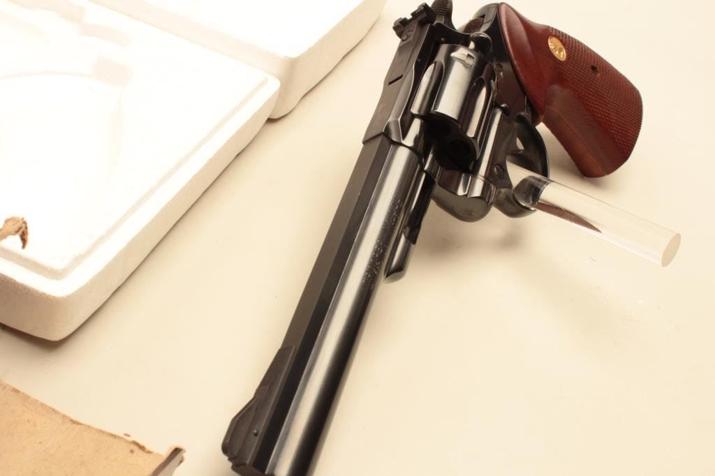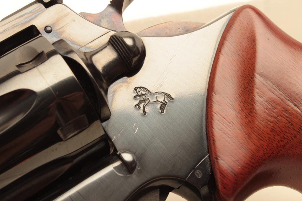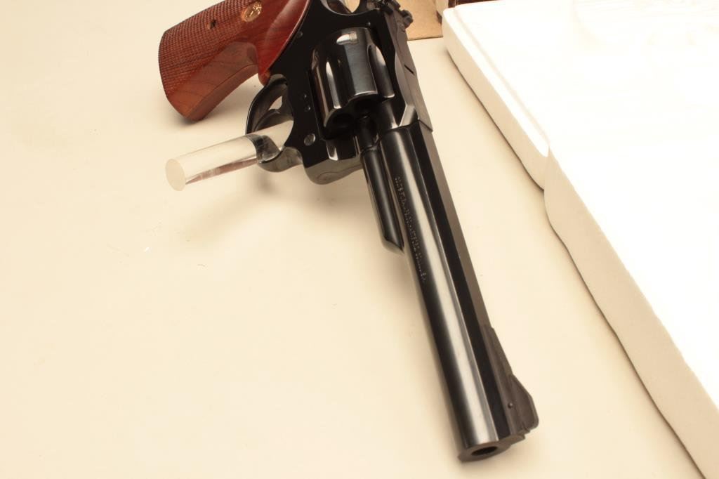 The pistol is as new in the original box with a 6” barrel. The barrel retains nearly all of its blue finish with a ramp front and adjustable rear sights. The cylinder shows a faint drag line, while the hammer displays beautiful case hardening. The checkered gold medallion grips are in excellent condition with sharp checkering. The bore is very good, the markings are sharp and action is crisp. The pistol comes in the factory woodgrain cardboard box which shows wear with some tattering at the ends and includes all associated packing material and literature. Est.: $600-$1,200. (Modern).
