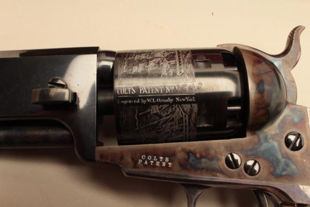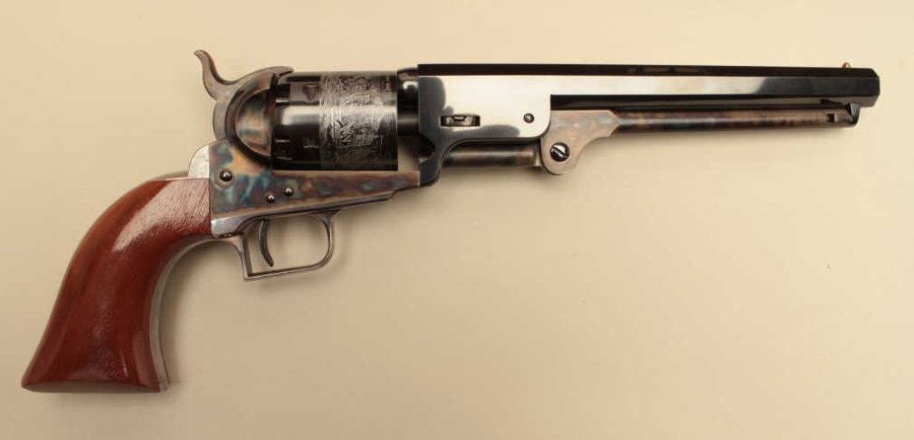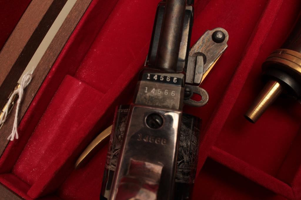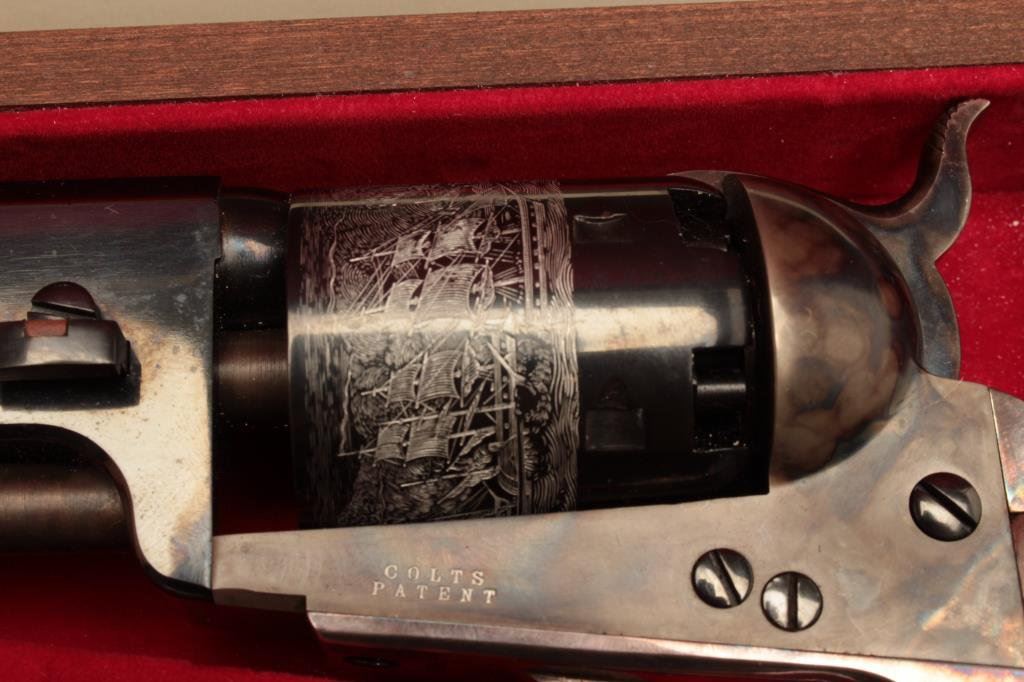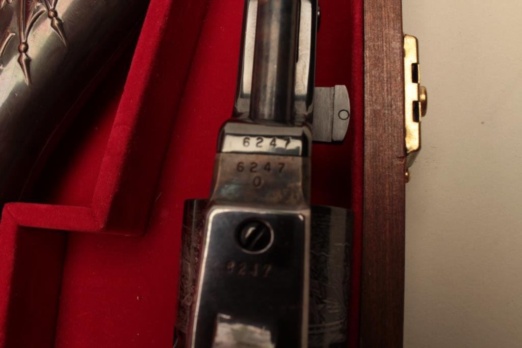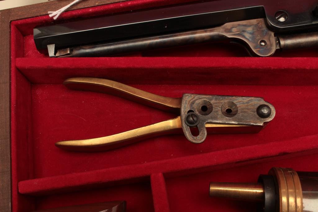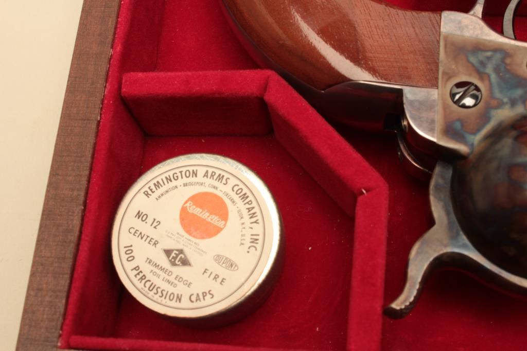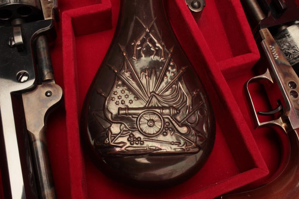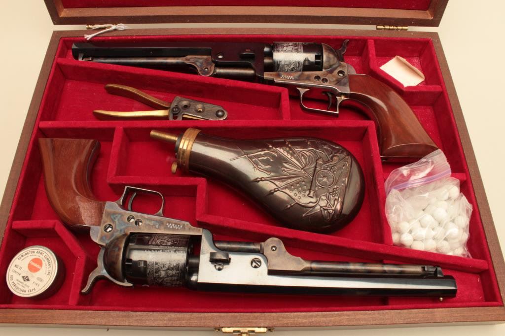 Navy square back revolvers. Serial # 6247 and #14566, the pistols are as new with only light handling marks. The pistols are double cased in a wood display case with new manufactured powder flask, percussion cap tin, mold and lead balls. The case features a red velvet interior in very good condition. Est.: $700-$1,400.