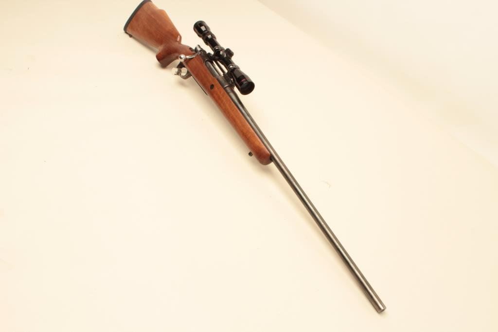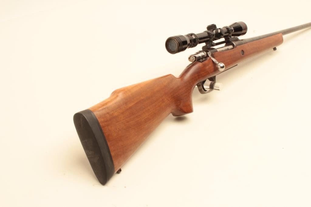 Rem. Mag. caliber, Serial #P73708. The rifle is in good overall condition with a 24” barrel. The barrel and receiver show significant thinning blue finish with areas of loss and light surface erosion. The bolt handle has been chromed and ground to allow for scope clearance. The smooth wood stock is in good condition showing wear consistent with carry and use. The butt ends with a rubber Decelerator pad providing a 14 ¼” LOP. The bore is fiat and may clean, the action is crisp and markings are legible. The rifle is topped with a one-piece Redfield base and a Simmons 3 x 9 x 32 variable power scope. Est.: $250-$500. (Modern).