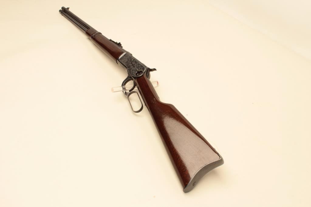#K 029267. The carbine is in very good overall condition with a 20” barrel. The barrel and full-length magazine retain nearly all of their blued finish with only light handling marks. The receiver is engraved with a floral pattern, retains nearly all of its blue finish and retains the saddle ring. The smooth wood stocks are in good overall condition with some small mars and storage marks. The butt ends with a smooth steel crescent butt plate which is slightly proud at the toe. The bore is very good, the action crisp and markings are sharp. Est.: $300-$600. (Modern).