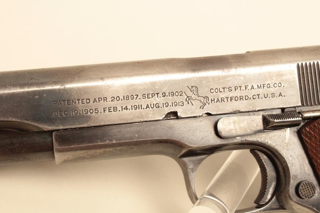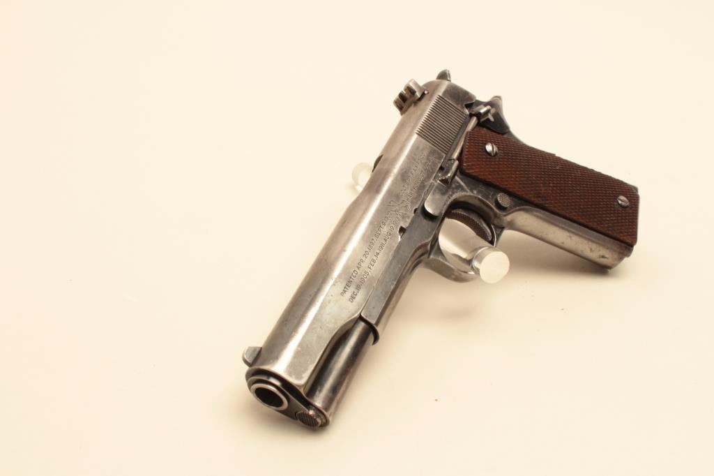 #C116683. The pistol is in good overall condition with a 5” barrel. The pistol retains the majority of its thinning military finish with loss of finish on the slide, high point edge wear and a replaced rear sight. The checkered wood grips are in good condition showing wear and use with some flattening of the checkering and a lanyard loop at the base of the knurled back strap. The bore is good, the markings legible and action is crisp. The lot does not include a magazine. Est.: $800-$1,600. (C+R).