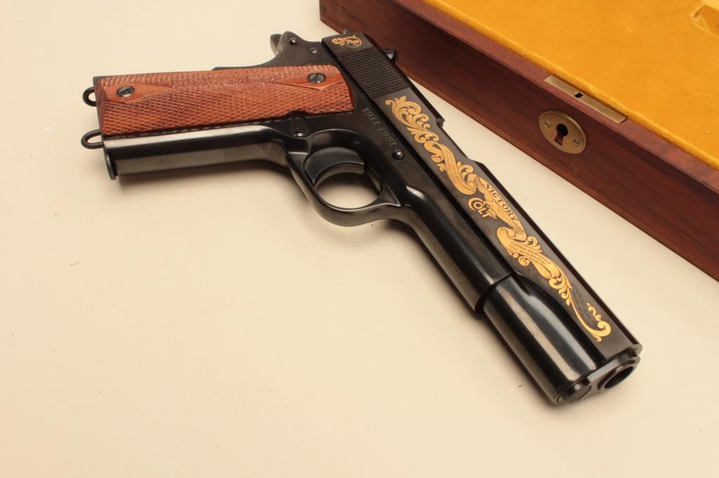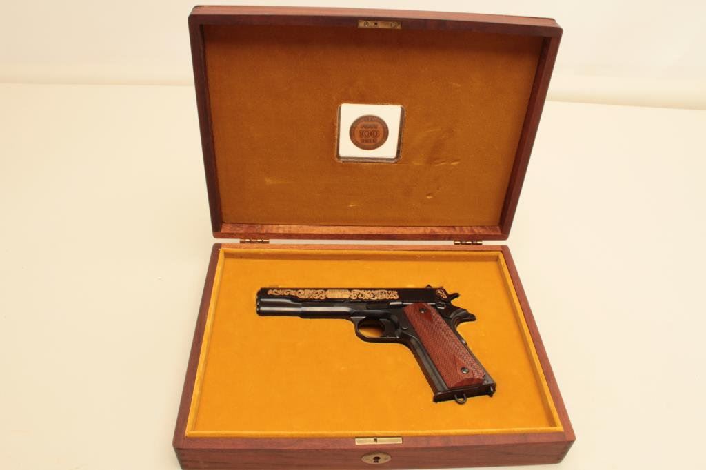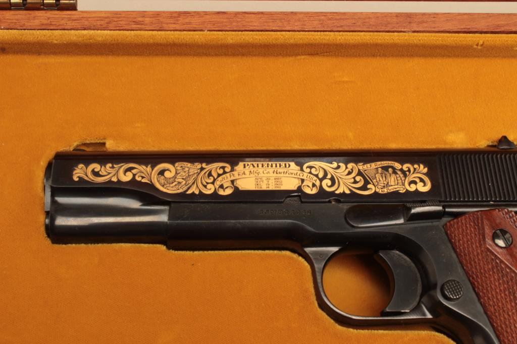 Serial #CJMBC1042. The pistol is in fine overall condition showing only light handling and storage marks. The slide is finished in gold wash inlay on both sides. The finely checkered wood grips are in excellent condition with sharp checkering. The pistol includes one correct magazine with lanyard loop. The pistol comes with its gold velvet lined commemorative wood display box with the Colt emblem and an NRA 100 year’s Centennial medallion inlayed in the lid of the case. The case and lining are in good condition. Est.: $800-$1,600. (Modern).