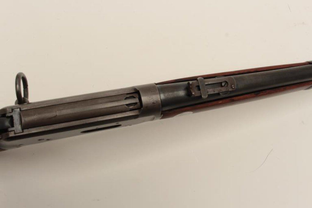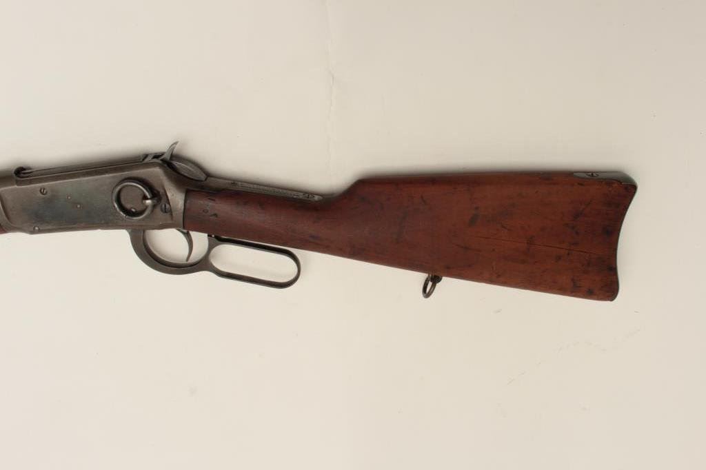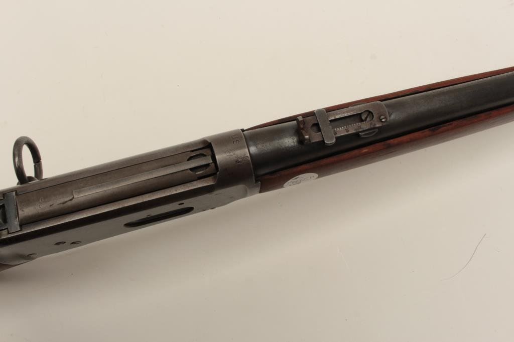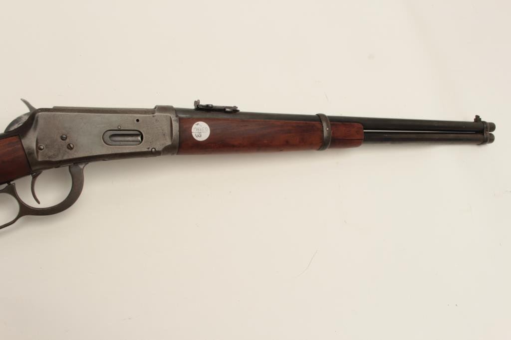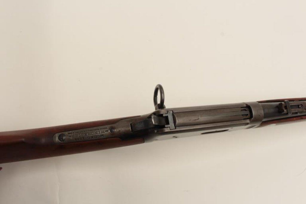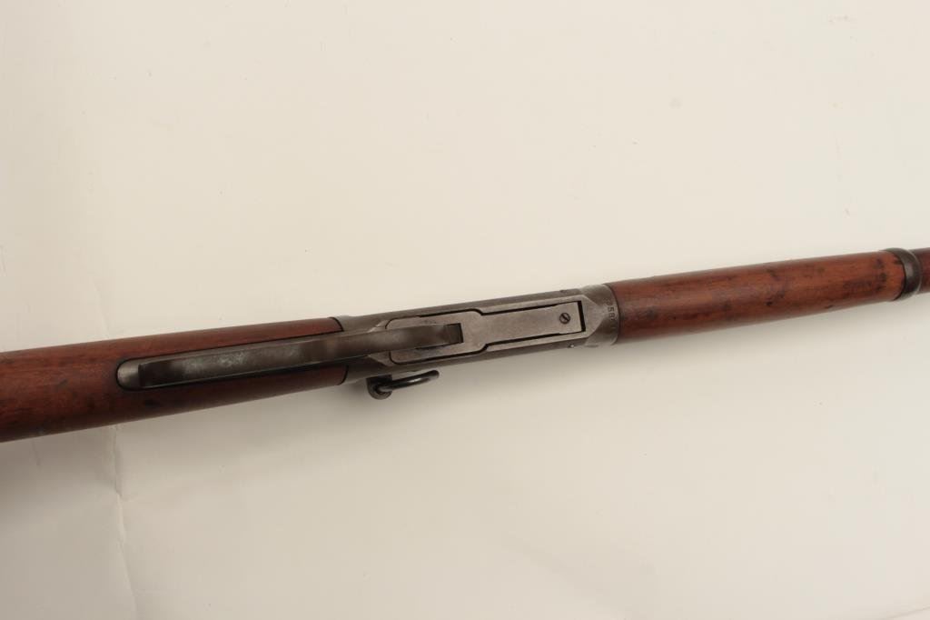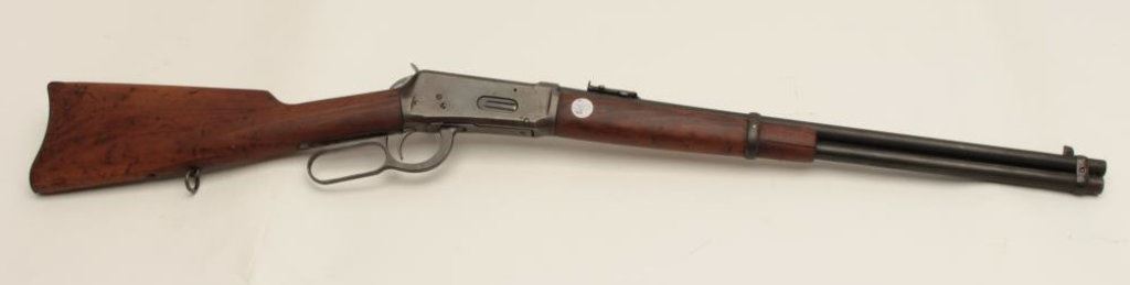 receiver with “flaming bomb” inspection, .30 W.C.F. caliber, 20” barrel, blued finish, wood stocks, S/N 835864 (ca. 1918), in overall good condition showing considerable blued finish remaining on barrel and loading tube with areas of blue on the receiver, good bore, good action, good markings and fair to good wood showing some light cleaning and several cracks to wood appearing to be from weathering; added ring to bottom of butt stock and an old hole behind it, likely for another position for a swivel or ring. Not easy to find in any condition and this one is decent. (C&R/No PPT). Est.: $1,250-$2,500.