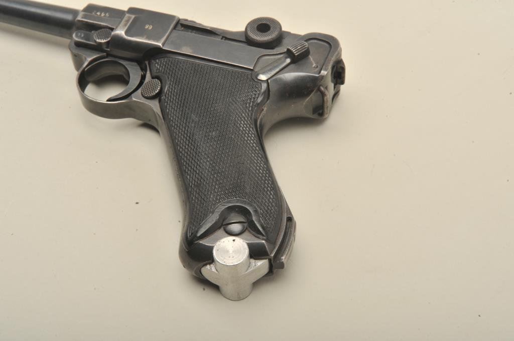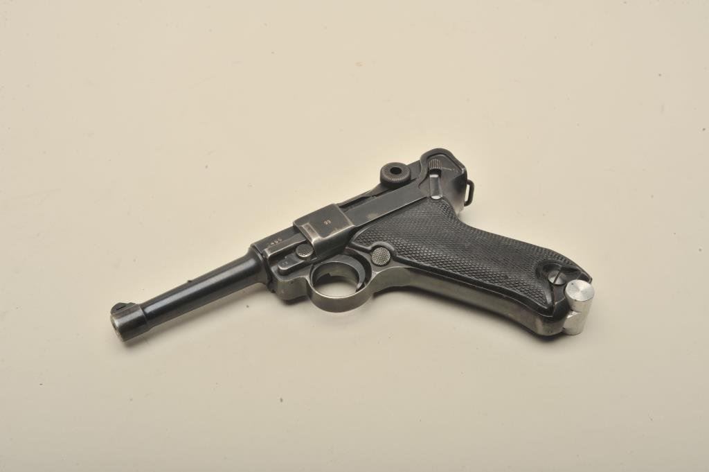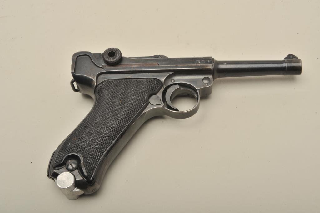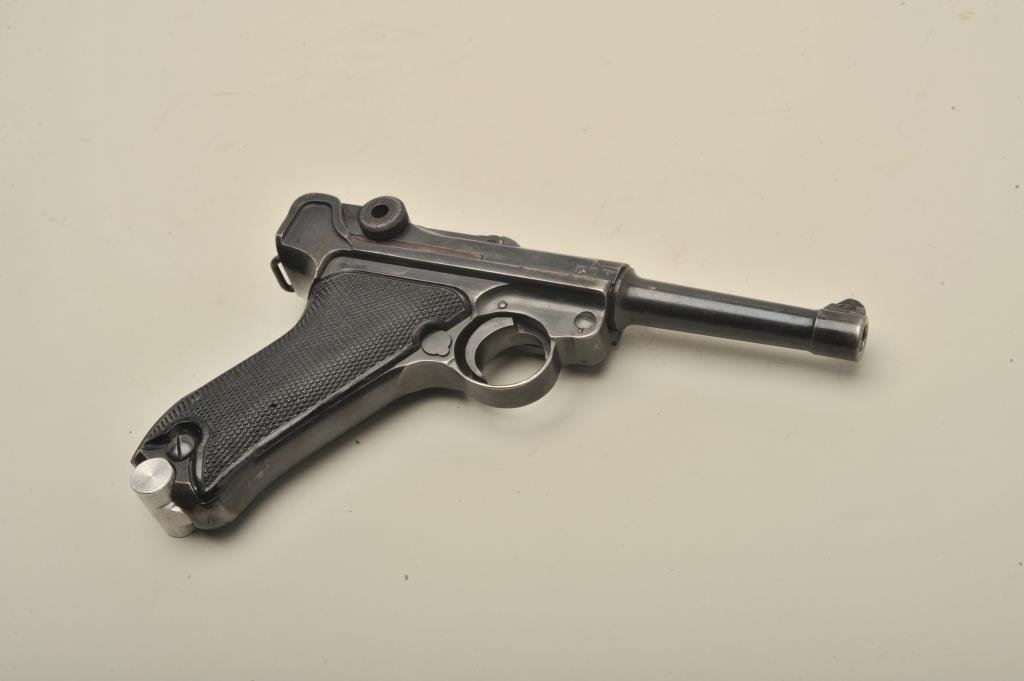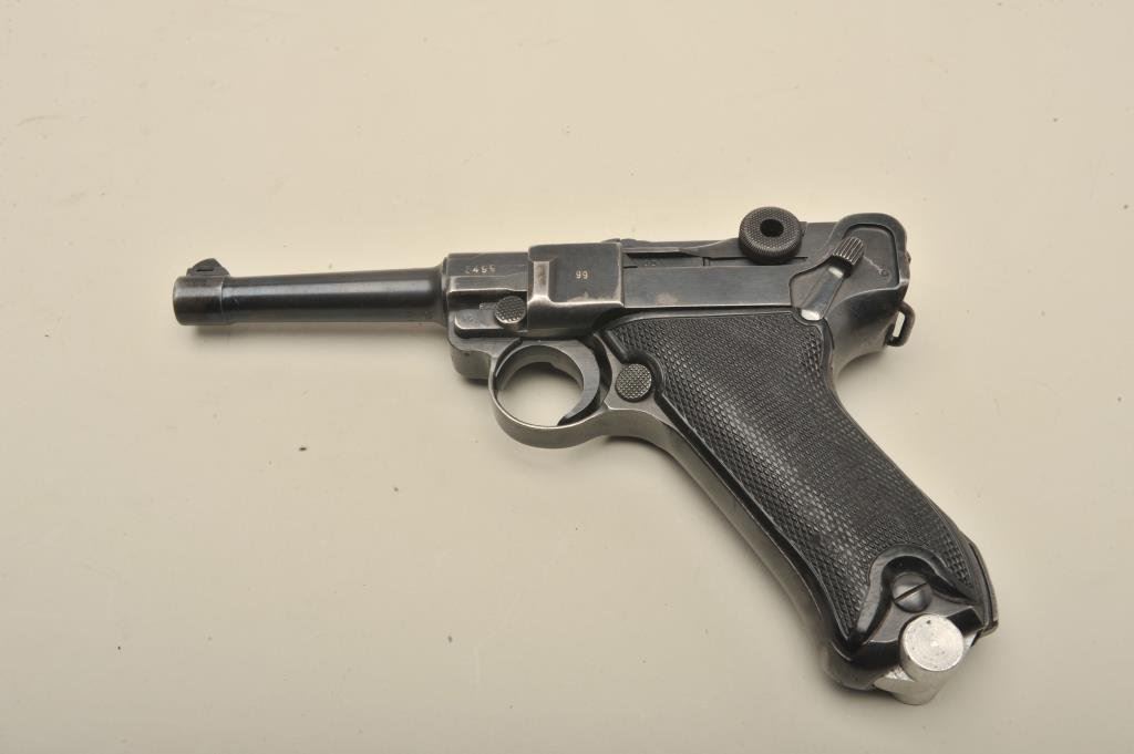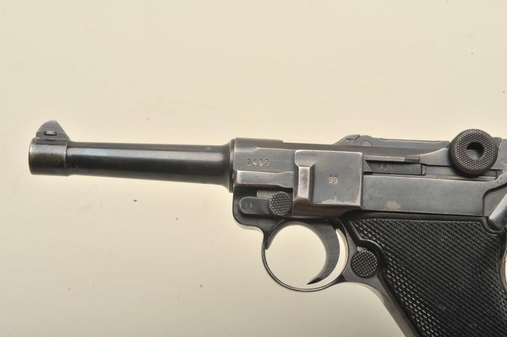 9mm caliber, 4” barrel, black finish, later non-German manufactured magazine, S/N 3499 (all matching visible except magazine); overall good + condition, nazi proofed, good bore, good action and markings, good grips. (C&R/PPT). Est.: $1,400-$2,800.