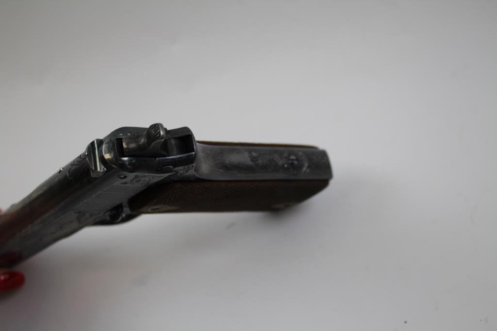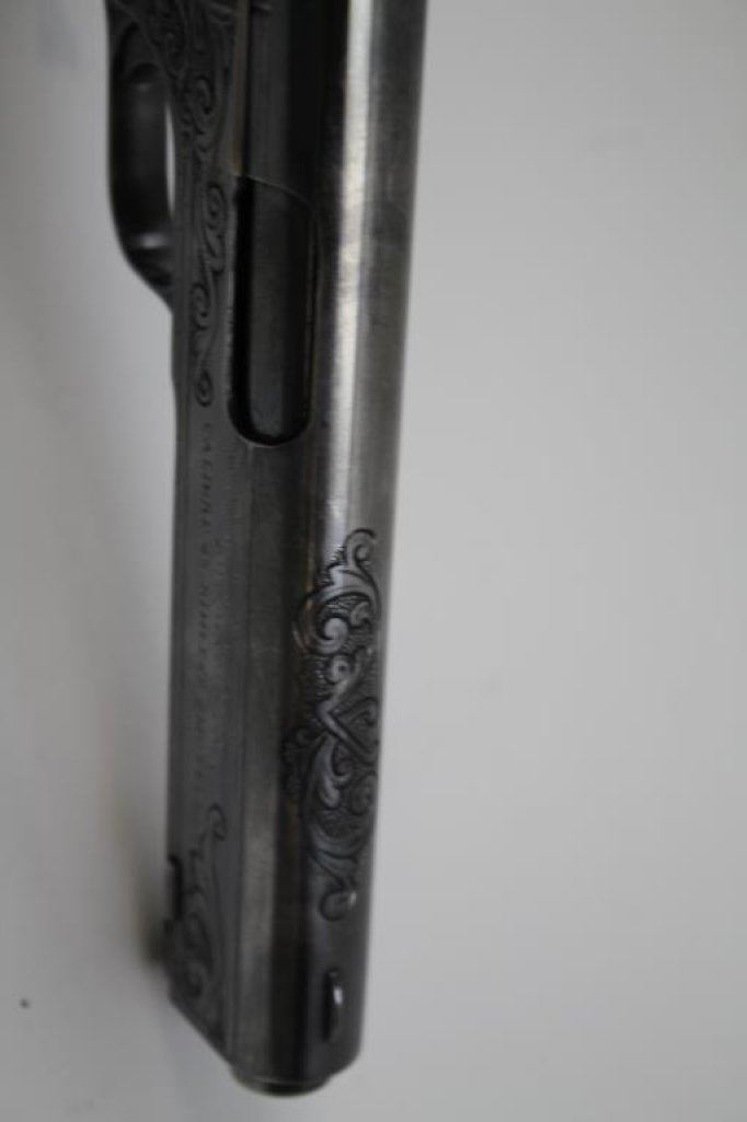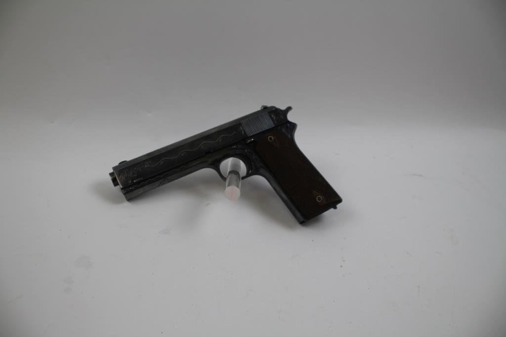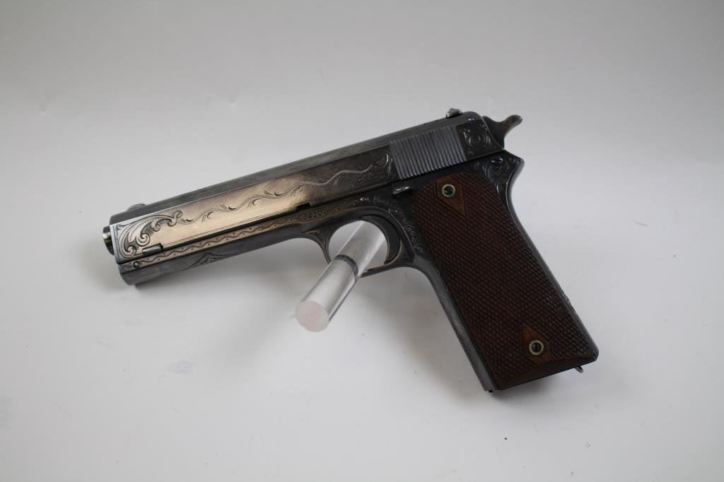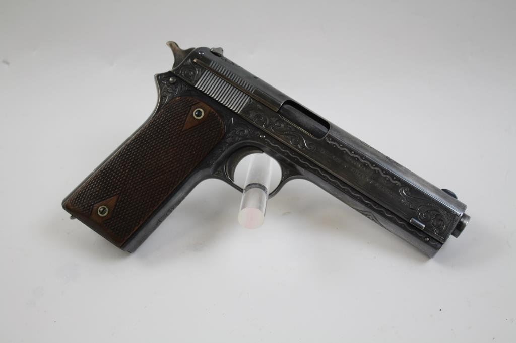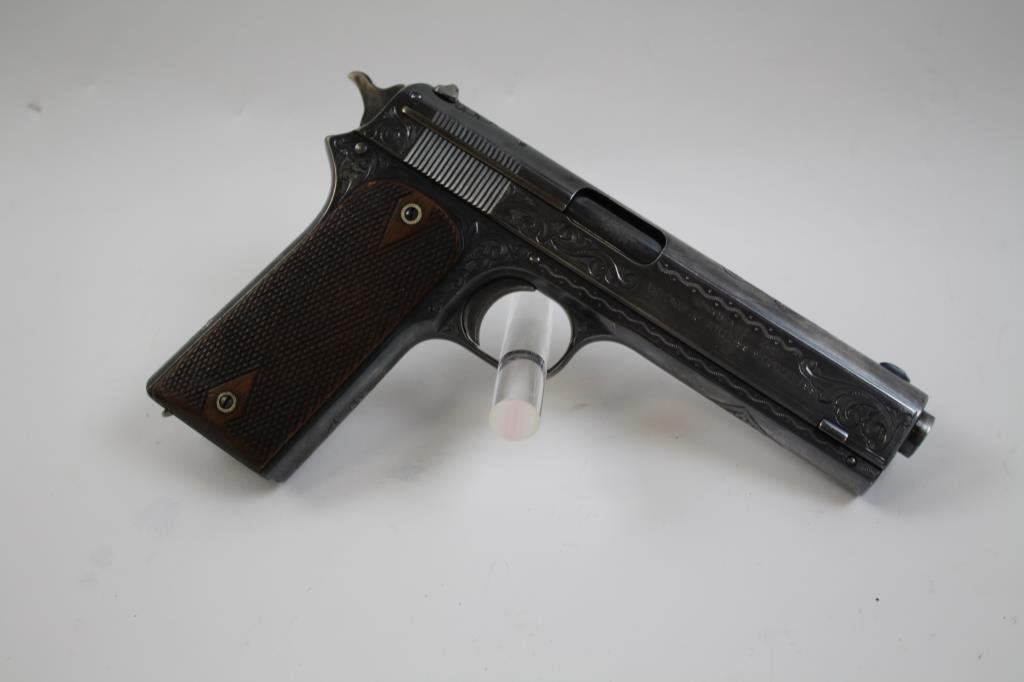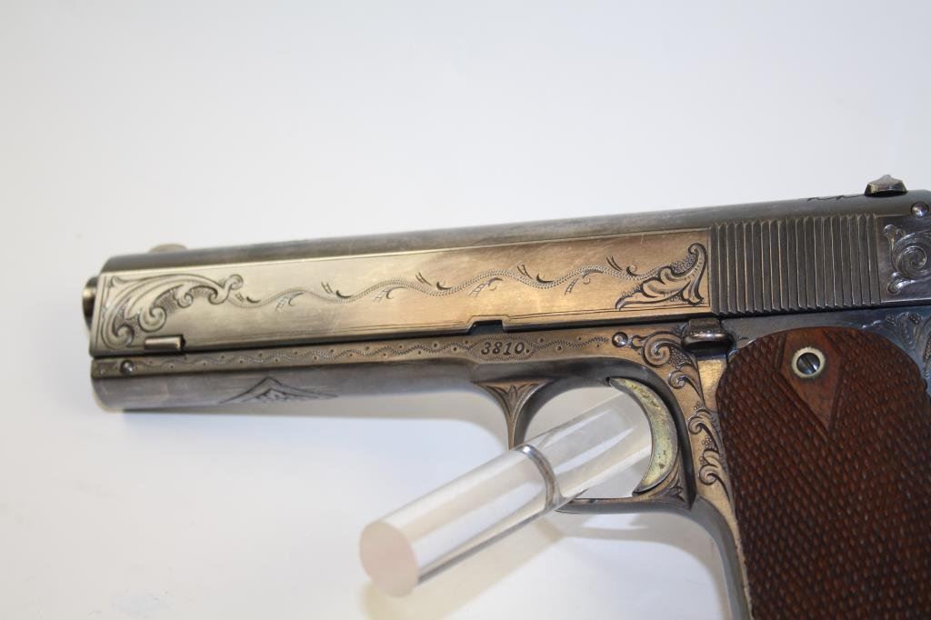 Lot 98 Colt Model 1905 semi-automatic pistol, engraved, blued finish, checkered wood