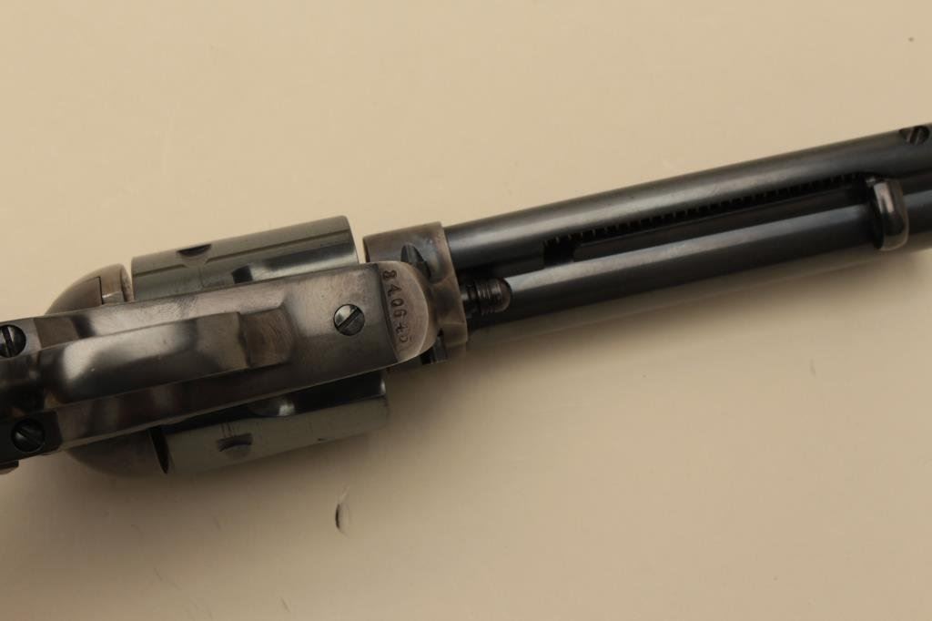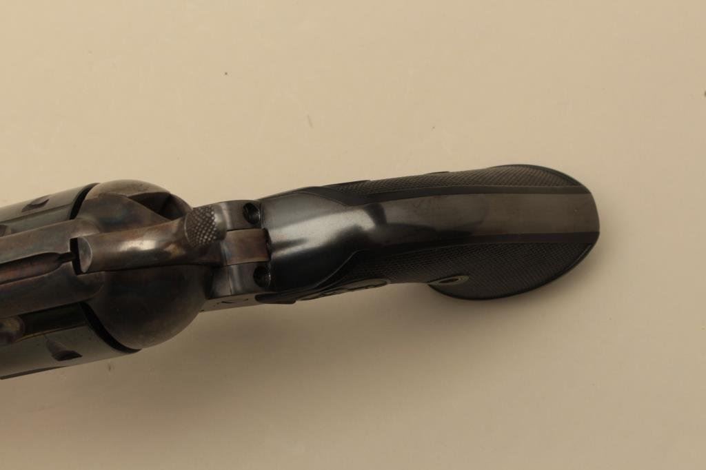 with a 4 ¾” barrel in fine original condition, S/N 340645. Factory letter confirms caliber and configuration. Shipped to “Shapleigh Hardware, St. Louis, MO, Nov. 20, 1920, 12 guns in shipment”. The revolver retains 955-98% original blue with shark fin (Late and proper) front sight of full height. The cylinder shows very light index line. The frame shows 80%-90% original case colors just toning slightly. The hammer shows 90%-95% bright and fiery case. The grips are excellent. Proper last 2 digits on the cylinder and matching beneath the grips on the straps. A 9+ on a 42745 scale and collector’s quality. (C&R/PPT) Est.: $5,000-$10,000