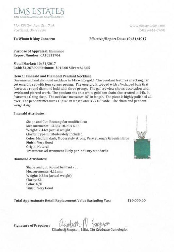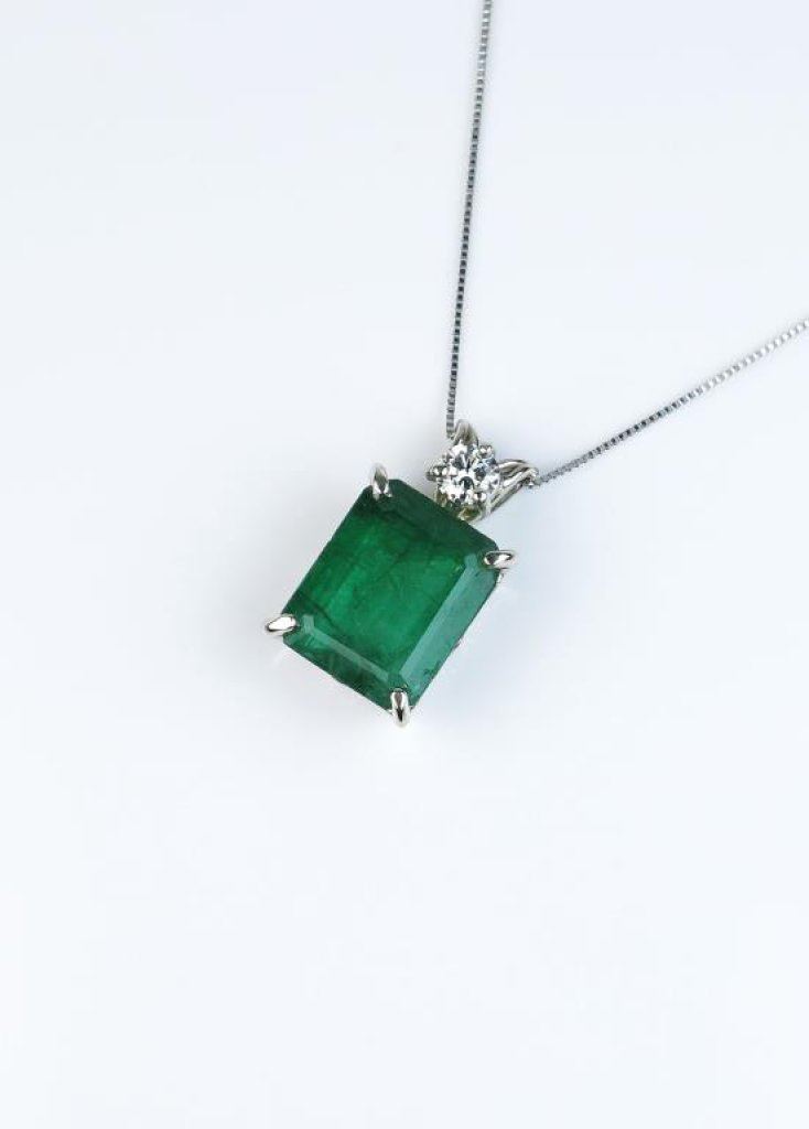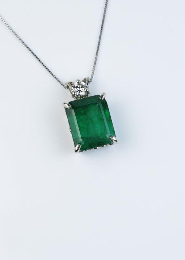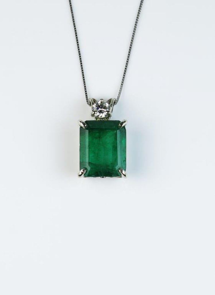 Lot 100c Elegant pendant featuring a 7.44 carat fern Green Emerald and