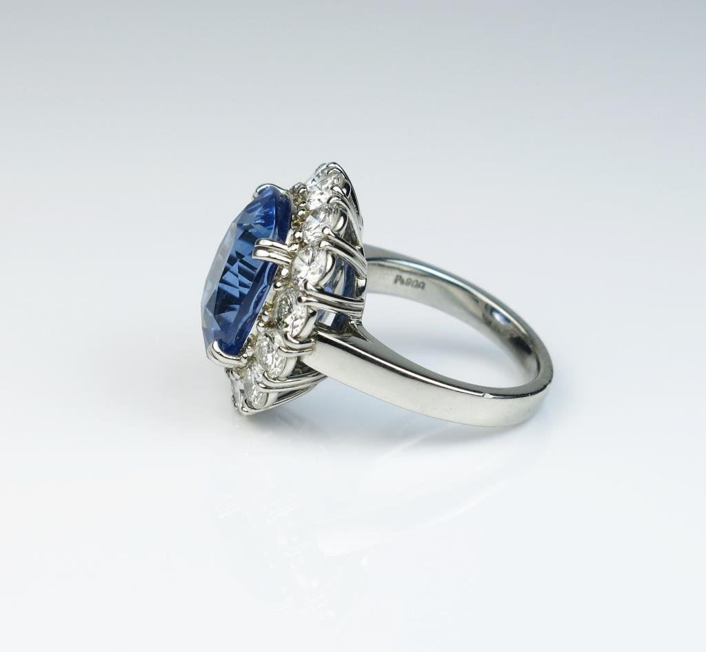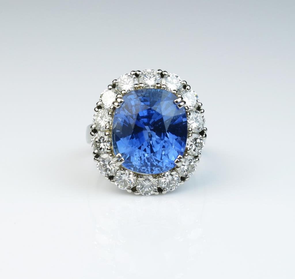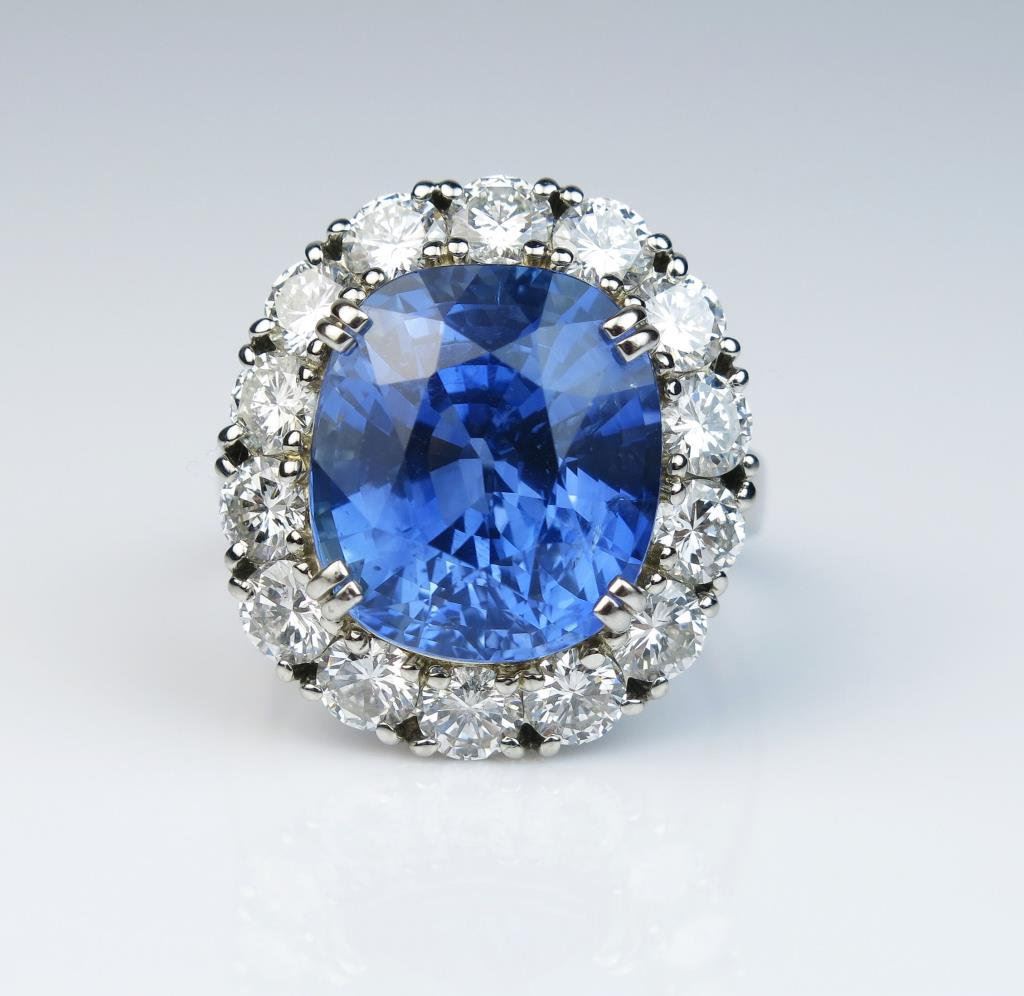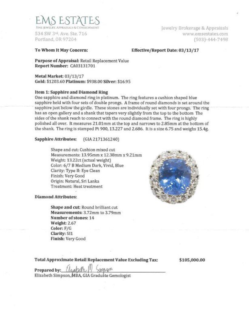Ceylon Sapphire weighing 13.22 carats and surrounded by 14 full cut diamonds weighing approx 2.67 carats of F-G colors set in a custom handmade Platinum mounting Full Retail Appraisal at $105,000.00 Est:$40,000-60,000
